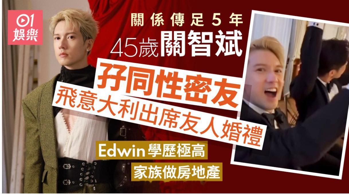 港媒曝关智斌和男友出席友人婚礼港媒曝45岁关智斌带着绯闻男友Edwin去意大利参加朋友婚礼,传两人在一起五年了。 Edwin背景显赫,南加州大学硕士兼房产总监,是房地产龙头「潘正洲集团」的主席的小儿子。
