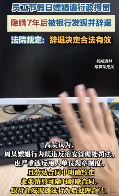山东济宁,一银行员工周某,签了无固定期限劳动合同,合同规定违反单位规章制度可解除合同,在放假期间,周某嫖娼被行政拘留10日、罚款5000元,他隐瞒不报。被单位发现后,依规章制度将其辞退。周某不服申请仲裁,仲裁委裁决继续履行合同。银行不服起诉,一审二审银行胜诉,周某又申请再审。 (来源:西安晚报) 时间回溯到2005年,周某凭借自己的努力和能力,与银行签订了一份无固定期限劳动合同。这份合同对于周某来说,就像是一份稳定的保障,让他能在银行安心工作。 合同里还明确写着,如果员工违反单位的规章制度,单位是有权利解除劳动合同的。当时周某也没多想,觉得只要自己好好工作,遵守规定,就不会有什么问题。 2011年9月,周某迎来了放假时间。本可以好好休息放松的他,却没能克制住自己的欲望。 在欲望的驱使下,他做出了一个错误的决定——去 嫖 娼。 他以为这只是一次偷偷摸摸的行为,不会被人发现。可他没想到,天网恢恢,疏而不漏。警方在执法过程中,当场将周某抓获。 最终,周某因为自己的违法行为,被行政拘留了10日,还被罚款5000元。 这对于周某来说,无疑是一个沉重的打击。他不仅失去了10天的自由,还损失了一大笔钱。 更糟糕的是,周某担心这件事情会影响到自己的工作。他害怕银行知道后会辞退他,毕竟这份工作对他来说太重要了。 于是,他选择了隐瞒。他就像一个做错事的孩子,不敢把真相告诉家长一样,把这件事深深地埋在了心底。 他每天照常去银行上班,装作什么事情都没有发生过。在同事和领导面前,他还是那个勤奋工作的好员工。 时间一天天过去,周某以为这件事情就这么过去了,不会再有人提起。可他错了。 2017年,银行在进行一次常规的审查和调查时,意外地发现了周某在2011年的那次嫖娼行为。 银行得知这个消息后,觉得周某的行为严重违反了银行的规章制度,给银行的名誉和形象带来了极大的损害。 银行依据自己制定的《员工违规处理办法》,决定辞退周某。 在做出这个决定之前,银行还征求了工会的意见。工会经过讨论后,也认为周某的行为不可原谅,支持银行的决定。于是,银行正式通知周某,他被辞退了。 周某接到通知后,心里十分不服气。他觉得自己已经为这件事情付出了代价,被拘留和罚款,而且事情已经过去这么多年了,银行现在才来处理,太不合理了。 于是,他向劳动仲裁委申请仲裁,希望仲裁委能裁决银行继续履行和他的劳动合同,让他回到银行继续工作。 仲裁委受理了周某的申请,并进行了调查和审理。 仲裁委认为,虽然周某的行为确实违反了银行的规章制度,但是事情已经过去了7年,银行现在才来处理,时间间隔太长,处理起来不太合理。 所以,仲裁委裁决银行继续履行和周某的劳动合同,让周某回银行上班。 银行对这个裁决结果非常不满意。他们觉得自己的处理是合理合法的,周某的行为严重违反了规定,就应该受到惩罚。 于是,银行向法院提起了诉讼。 银行在周某嫖娼7年后才依据规章制度将其辞退,这种处理方式是否合法呢? 依据《劳动合同法》第三十九条,劳动者严重违反用人单位的规章制度的,用人单位可以解除劳动合同。这里并没有对发现违规行为的时间作出限制。 周某在2011年9月放假期间嫖娼,被行政拘留10日、罚款5000元,这明显属于严重违反社会公序良俗的行为。 而且银行有《员工违规处理办法》,其中很可能将此类严重违反道德和法律的行为列为违规情形。 有人可能会问,都过去7年了,银行还能处理吗? 其实,虽然时间过去了很久,但周某一直隐瞒自己嫖娼被处罚的事实。单位在2017年发现这一情况后,依据规章制度将其辞退,并且征求了工会意见,程序上是合法的。 就好比一个人犯了错,一直藏着掖着,以为能躲过去,但纸终究包不住火。一旦被发现,单位还是有权利依据规定进行处理的。周某的隐瞒行为,使得单位在7年后处理他也是合理的。 还有人会说,这么长时间了,单位是不是故意找茬? 但从法律角度讲,只要单位的规章制度合法,且处理程序正当,就不存在故意找茬的问题。单位制定规章制度就是为了规范员工行为,维护正常的管理秩序。 一审法院经过审理后,认为银行的《员工违规处理办法》是合法有效的,周某的嫖娼行为属于严重违反规章制度的行为,虽然事情过去了7年,但因为周某隐瞒不报,银行在发现后有权进行处理。 所以,一审法院判决银行胜诉,支持银行辞退周某的决定。 周某不服一审判决,又向二审法院提起了上诉。 二审法院经过仔细审理,认为一审法院的判决事实清楚,证据充分,适用法律正确。 所以,二审法院维持了一审判决,银行再次胜诉。 周某还是不甘心,他又向高院申请了再审。 高院经过审查后,认为周某的申请理由不成立,最终驳回了周某的再审申请。