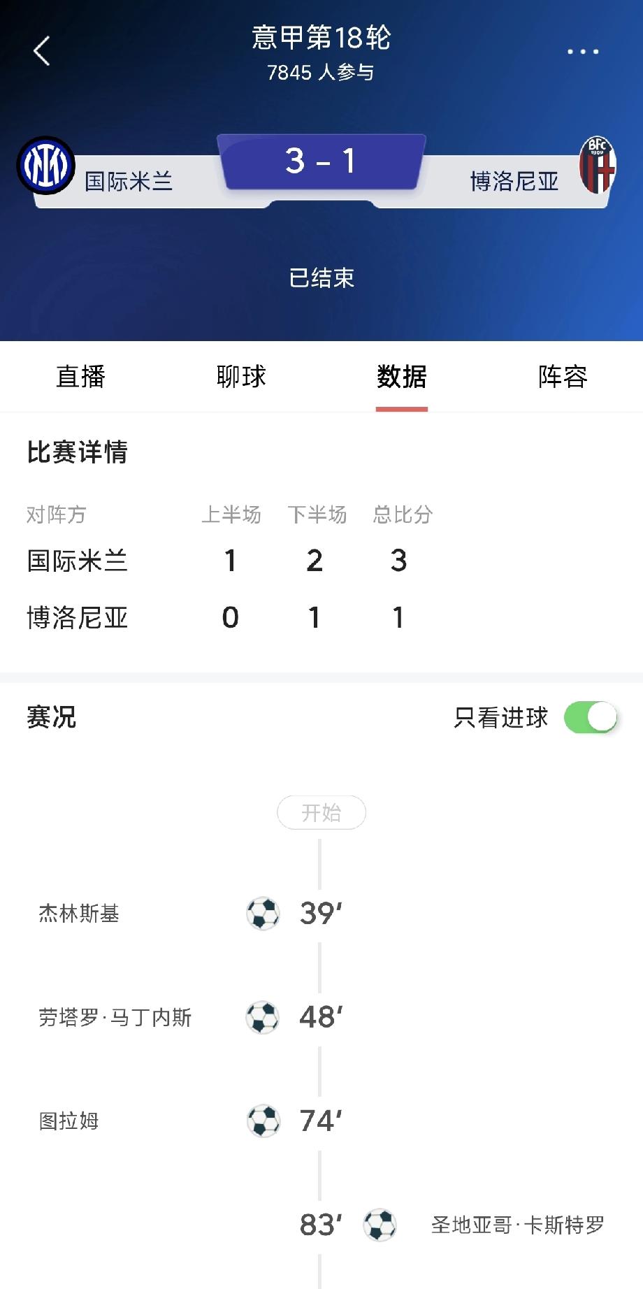 国米再登榜首! 在刚刚结束的意甲联赛第18轮比赛中,国米主场3比1击败苦主博洛尼亚,再次领跑积分榜,让让广大阿毛们失望了!
