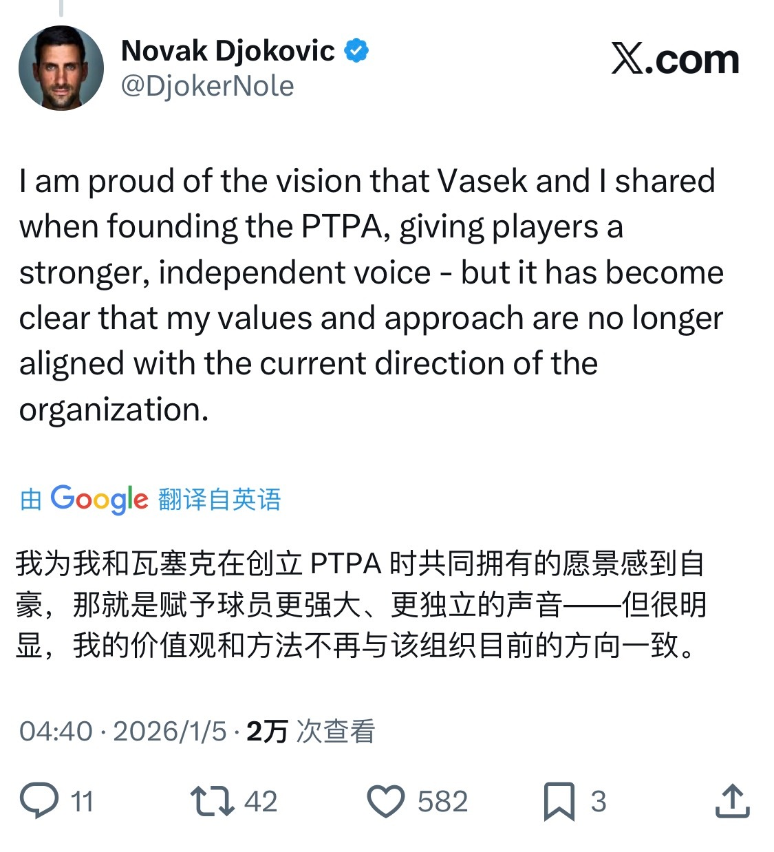 德约科维奇深夜在个人平台连发三帖,郑重声明,将正式退出自己联合创立的职业网球选手
