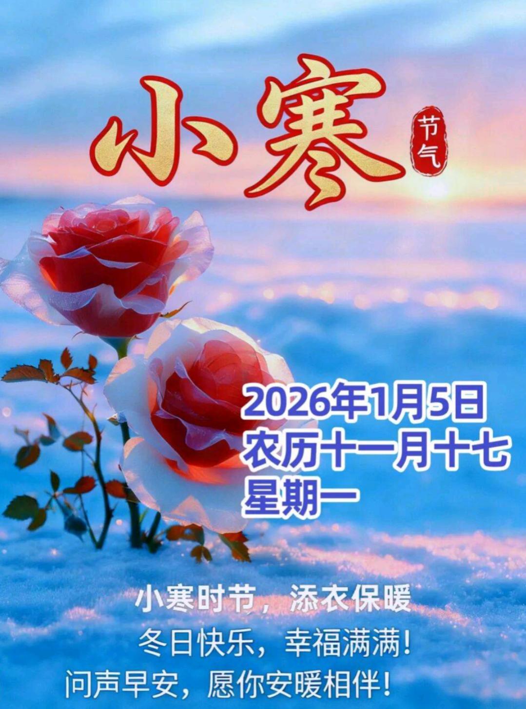 【今日小寒】 今天是2026年公历1月5日,农历十一月十七,我们迎来了小寒节气,小寒,是二十四节气中的第23个节气,冬季的第5个节气,小寒标志着季冬时节的正式开始,冷气积久而寒,小寒意味天气寒冷,但是寒冷程度还没有达到极致。 寒冬虽冷,问候暖心,记得添衣保暖,照顾好自己,愿生活事事如意,繁花似锦,安康常伴左右。小寒快乐!☕️🌹❤️🌞