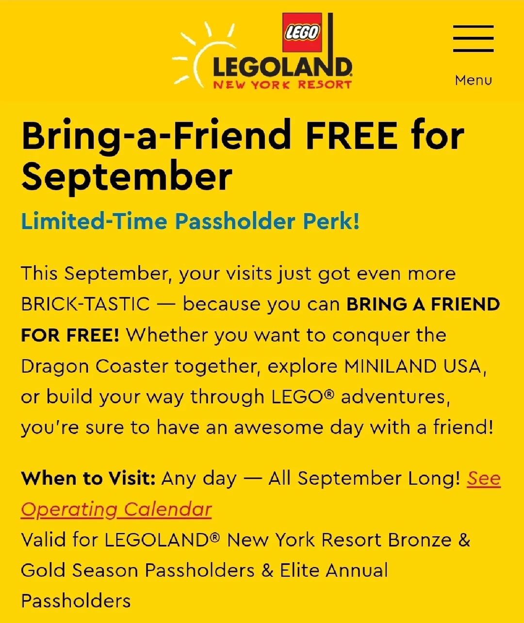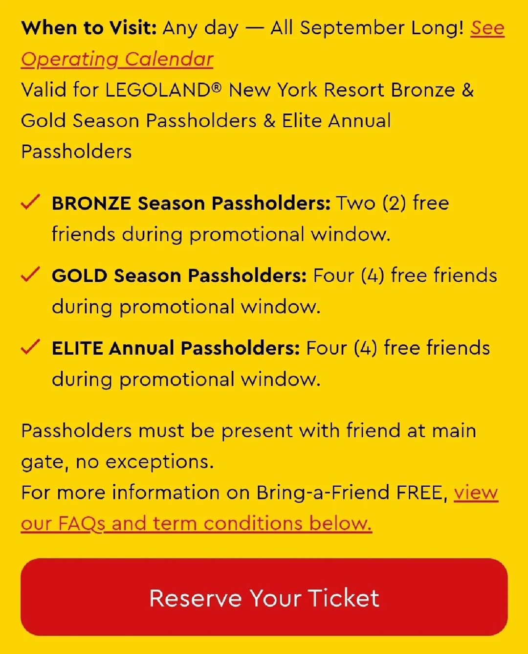 天啦噜,纽约乐高乐园9月会员福利太震惊了! 竟然每个会员送4张免费亲友票! 而且整个9月都能使用!周末也行! ☑️bronze会员,可以带2名亲友免费入场 ☑️golden和elite会员,每人可以带4名亲友免费入场! ‼️免费票可以在会员benefits页面 redeem 搜 ny legoland member benefits 就行 不过条款说需要会员本人陪同哦~ . 具体福利条款见图2-3 . ❤而对于想单次去乐高的小伙伴来说 9月等于买一张普通会员 bronze pass 送2张亲友票 $119+tax就可以一家三口入场啦!😍😍😍 . 我是纽约小宝贝Ivy 带你看纽约100个浪漫花海/宝藏景点/遛娃地