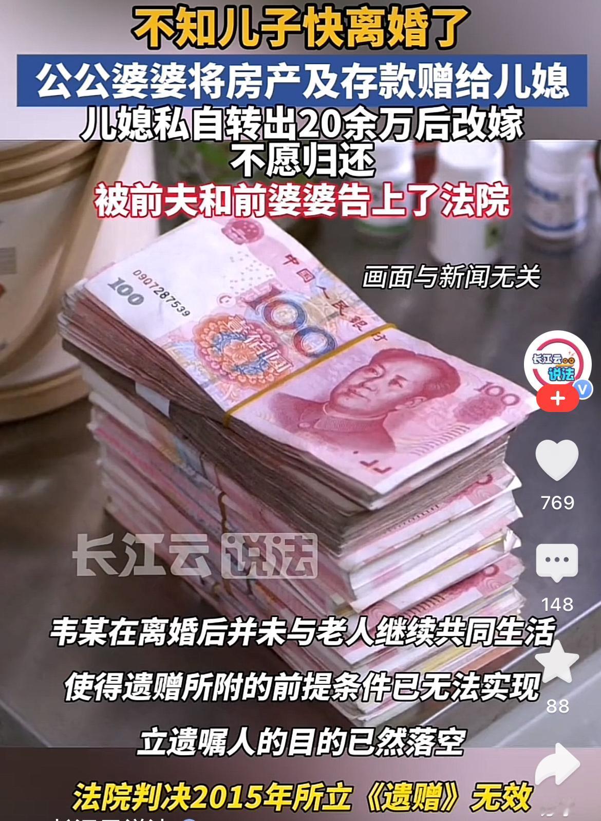 这世上怎么会有这么好的公公婆婆, 竟然想要把自己的全部财产都留给儿媳妇,怕他们不在了儿子欺负她,只可惜他们错付了真心。 原来这对老人的儿子儿媳结婚没几年因为矛盾打算离婚了,正在走离婚手续的期间,男子的父母还不知道这个情况。 两位老人私下里把自己的财产房子全部都赠给了儿媳,想要让他们过好日子,让儿媳不受欺负。 只是这个儿媳已经在和儿媳办理离婚了,但是没有告诉老人,还把老人给的钱全部转到自己的私人账户了。 最终法院判了,女子要全额返还所有的钱,幸亏是追回来了,这样的好公婆真的太难得了。