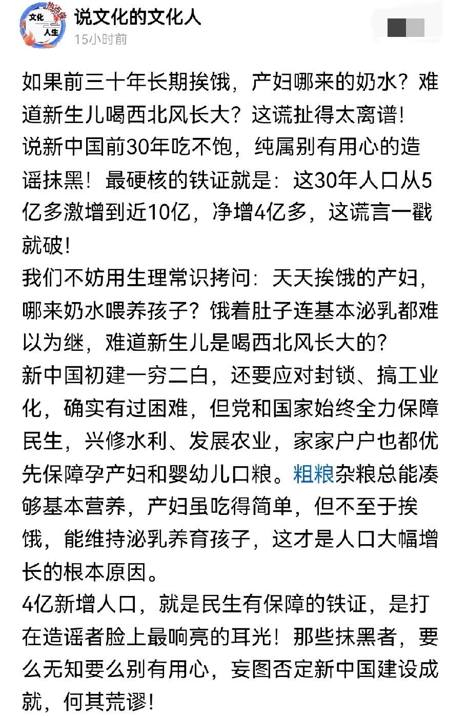很难想象,这是一个“文化人”放的。 这位“文化人”说,那三十年没有人挨饿,民生有足够的保障,凡是造谣那时吃不饱穿不暖的,都是别有用心,极其荒谬。 不知道这位“文化人”多大年纪,是没经历过还是天生就是坏种,要知道五六十年代出生的人,还没死绝呢。 七十年代以前,吃得饱的人,不多。我那时候十几岁,正是长身体的时候,每月26斤粮食定量,半斤油,半斤肉。每天的感觉就是没吃饱,饿不死,但是吃不饱。有些二货说:你家咋不去自由市场买粮食吃?呵呵,这话确实二,还一脑袋水,脏水。就这,还是有“保障”的“城市居民”,农村更惨。 我不怪罪任何人,国家新立,没有经验,四面皆敌,碰上困难在所难免,但不能矢口否认指鹿为马颠倒黑白,那样既不文化,连个人都算不上。幸亏79年那个伟大的年代,改开了,特色了,国家开始好了,不然这位“文化人”还是每月半斤肉(就小半碗),就没力气在这儿装13了。