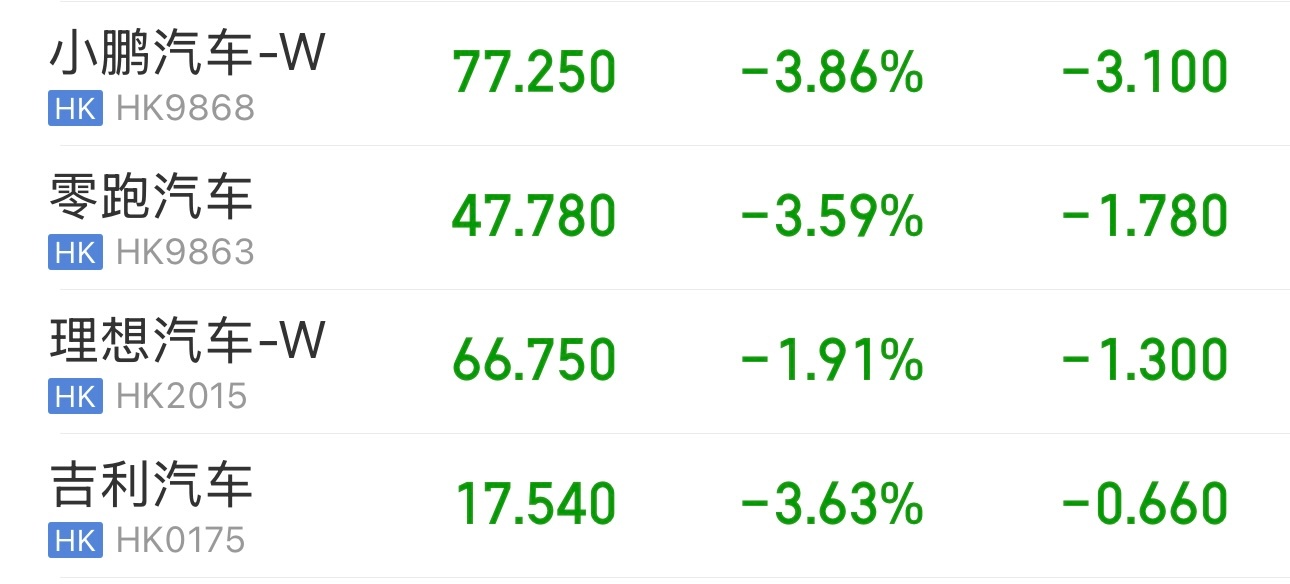 今天汽车股小鹏汽车、零跑汽车、理想汽车、吉利汽车怎么都在下跌呢。对了,小米目前股价也是下跌中。备注:我目前一股汽车都没有,只关注,不买。