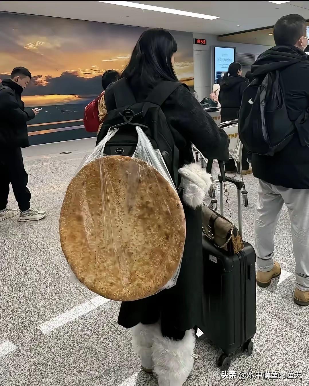 一女子在机场等着过安检,万万没想到女子的背上竟然背了一个硕大无比的馕,远看这馕占据了女子一半的身高,网友热议:这么大的馕需要多么大的锅才能做出来呀! 安检口的工作人员都看愣了,手里的扫码器顿了两秒才继续操作。女子穿着简单的牛仔外套,背着馕的肩带垫了块布,脸上带着点不好意思的笑意,主动解释:“这是给我妹妹带的,她在外地读大学,快一年没吃到家乡的味道了。” 周围乘客纷纷拿出手机拍摄,有人小声议论尺寸,也有人感慨这份牵挂的重量。后来网友扒出,这馕直径足有60厘米,重量超过5公斤,是新疆喀什一位有着30年手艺的老师傅特意定制的。 女子叫热孜万,家在喀什老城,妹妹古丽去年考上了南方的一所大学。古丽第一次离家这么远,每次视频都念叨着想念家里的馕,说外面卖的要么口感不对,要么没有家乡的麦香。 热孜万听着心里不是滋味,专门找了社区里最有名的吐尔逊师傅。吐尔逊师傅一开始还劝她:“这么大的馕不好携带,也不好保存。”但架不住热孜万反复恳求,说妹妹就想吃一口地道的家乡味,师傅才答应下来。 做这个大馕可没少费功夫。吐尔逊师傅用了5公斤高筋面粉,搭配当地的天山雪水和面,发酵就用了整整8小时。烤馕的坑是传统的土坑,提前用果木烧到200多度,馕坯贴进去后还要控制火候,前后烤了40分钟才出炉。 刚烤好的馕香气扑鼻,麦香混合着芝麻的香味,在巷子里飘了很远。热孜万特意买了防水防油的专用包裹,又找了定制的肩带,才把这个“大家伙”顺利带到机场。 很多人觉得没必要这么麻烦,快递或者买小一点的馕不行吗?热孜万的想法很实在:“快递过来的馕会变软,失去刚出炉的口感。 小馕吃几天就没了,这么大一个,妹妹能和室友们一起分享,让她们也尝尝新疆的味道。”古丽收到馕的时候,在宿舍里哭了。 她把馕分成了十几份,分给同学和老师,大家都赞不绝口,说从来没吃过这么香的馕。有同学说:“原来这就是新疆的味道,难怪古丽一直念念不忘。” 其实这几年,类似的“家乡味快递”越来越多。有人背着几十斤的腊肉去外地,有人拖着装满辣椒酱的行李箱登机,还有人专门邮寄刚出锅的馒头。 这些看似“笨重”的食物,承载的都是最纯粹的牵挂。现在交通越来越便利,物流越来越发达,但很多人还是执着于亲自携带,无非是想让亲人吃到最新鲜、最地道的味道,这份心意是快递无法替代的。 吐尔逊师傅说,他做了一辈子馕,定制这么大的还是第一次。“现在年轻人都喜欢往外面走,但心里都惦记着家里的味道。”他感慨,馕在新疆人的生活里,从来不止是食物,更是乡愁的寄托。 无论是出门求学的学生,还是外出务工的人,临走时带上几个馕,就像带上了家的牵挂。 网络上有人调侃这个大馕“占地方”“不好带”,但更多人被这份亲情打动。有网友留言:“看到这个馕,想起了我妈给我装的咸菜坛子,当时觉得麻烦,现在想想全是爱。” 还有新疆网友补充:“真正的新疆馕,用的是本地小麦,烤出来外酥里嫩,放半个月都不会坏,这么大一个,够一家人吃好几天。” 这些带着温度的食物,打破了距离的隔阂。热孜万的大馕,不仅让妹妹吃到了家乡味,更让南方的同学们感受到了新疆的饮食文化。 它不像网红食品那样追求噱头,也没有刻意炒作,只是一份简单纯粹的牵挂,却比任何华丽的礼物都更打动人。 在这个快节奏的时代,我们总在追求效率和便捷,却常常忽略了那些慢下来的心意。 一个大馕,背后是师傅的匠心制作,是姐姐的千里奔波,是妹妹的日夜思念。它让我们明白,最珍贵的从来不是昂贵的物品,而是藏在细节里的牵挂。各位读者你们怎么看?欢迎在评论区讨论。