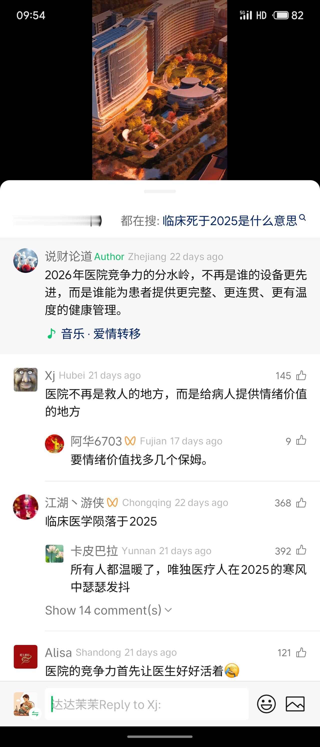 围绕“临床死于2025”这一话题展开讨论。评论者多表达对医疗行业转向的观察与担忧,认为医院竞争力正从设备技术转向“提供情绪价值”和“有温度的健康管理”,并戏称临床医学在2025年“陨落”。这些言论反映了部分公众对医疗体系过度强调服务与体验、可能弱化专业技术这一趋势的调侃与忧虑,也体现出当前医疗改革中不同理念的碰撞。整体情绪以讽刺和无奈为主。