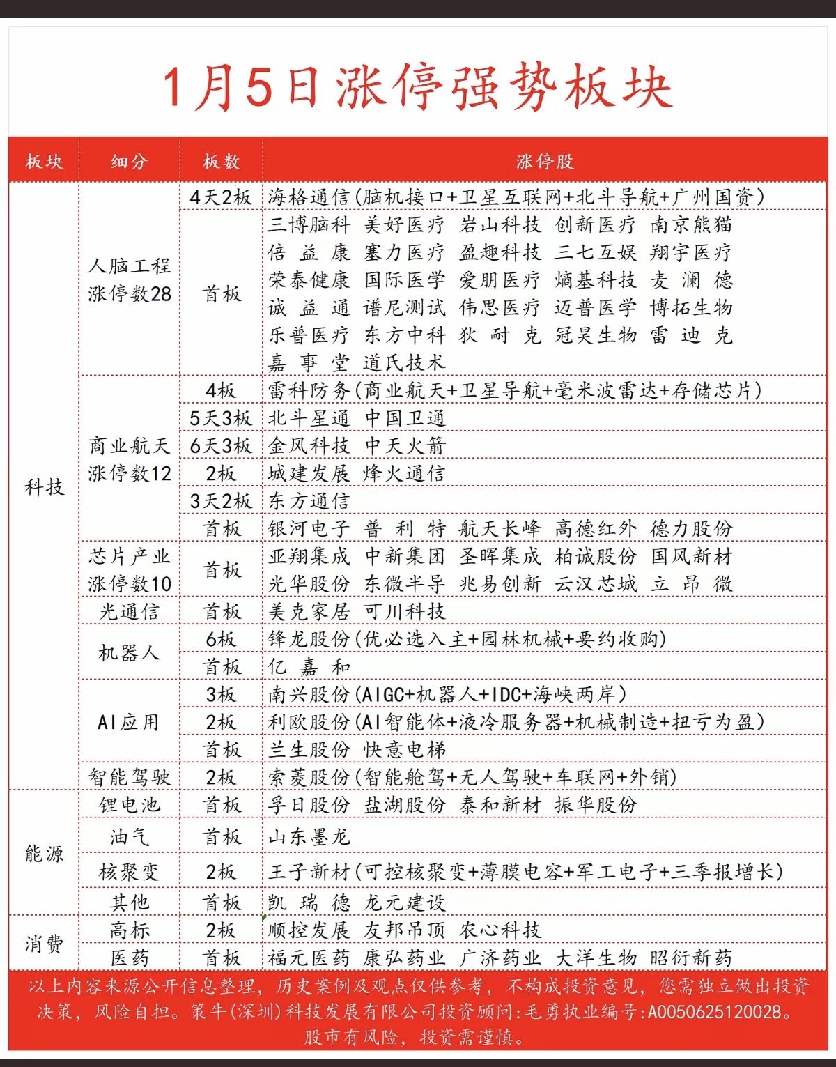 1.05周一 涨停板股票:题材+高度! 1.人脑工程 28股涨停 2.商业航天 12股涨停 3.芯片半导体 10股涨停 4.智能体ai应用 4股涨停