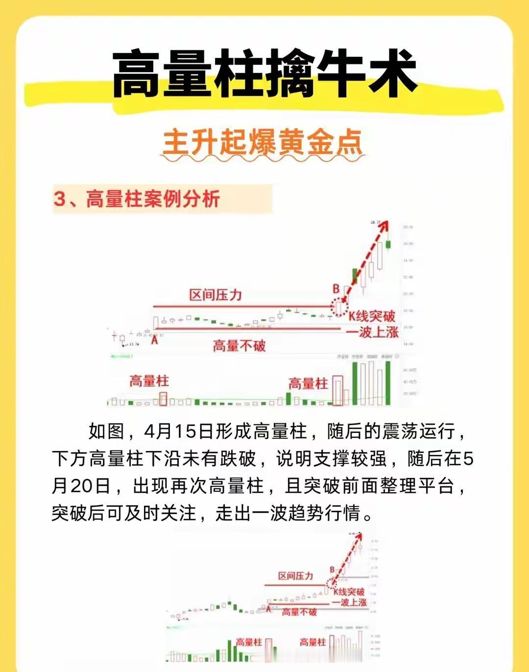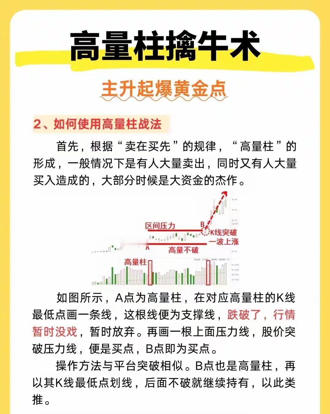 高量柱擒牛术核心总结: 1. 定义:高量柱是某阶段成交量明显高于前后交易日的量柱,是相对概念,由大资金推动形成。 2. 关键特征:易辨认,代表主力资金动向;“高量不破”指高量柱对应K线最低点画线后,后续走势未跌破,显示支撑强,但非介入点。 3. 使用方法:在高量柱K线最低点画支撑线(跌破则放弃),画压力线(突破为买点);后续高量柱不破支撑可持有。 4. 案例验证:高量柱后震荡不破支撑,再次高量柱突破整理平台时,可关注并捕捉趋势上涨行情。