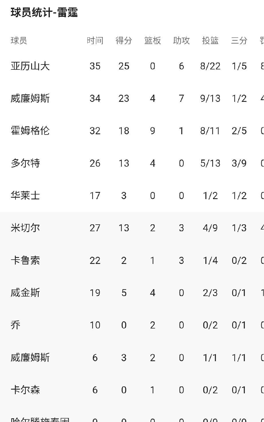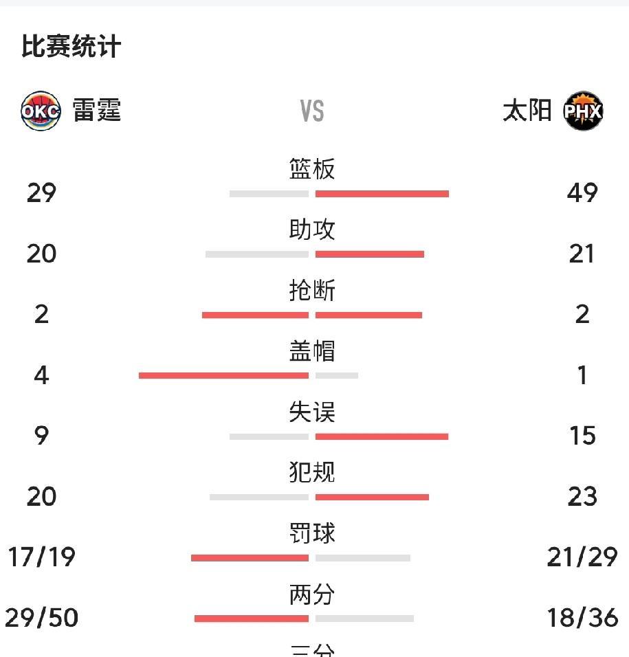 罕见!亚历山大三分失准,雷霆篮板被爆20个,客场憾负太阳。 谁都知道雷霆是一支外线为主的球队,内线只有霍姆格伦和哈滕可以依赖。哈滕本场因伤不能上场,导致雷霆内线空虚,即使如此,也没想到雷霆篮板竟然只抢到29个,而让对手太阳足足拿到49个篮板。上赛季太阳还以内线空虚缺中锋著称,本赛季拥有健康的马克·威廉姆斯、伊戈达罗和尼克·理查德森后略有好转,在联盟篮板排行榜上也只是排第23位,即使如此在失去哈滕的雷霆内线为所欲为,可以想象雷霆内线多虚弱。 雷霆全队外线低迷,三分球32投仅10中。投中最多的是多尔特的9中3,命中率最高的是霍姆格伦的5中2,亚历山大则只有可怜的5中1。反观太阳替补古德温一人三分就13投8中。当雷霆内线处于劣势,外线又不准时,想不输球都难。