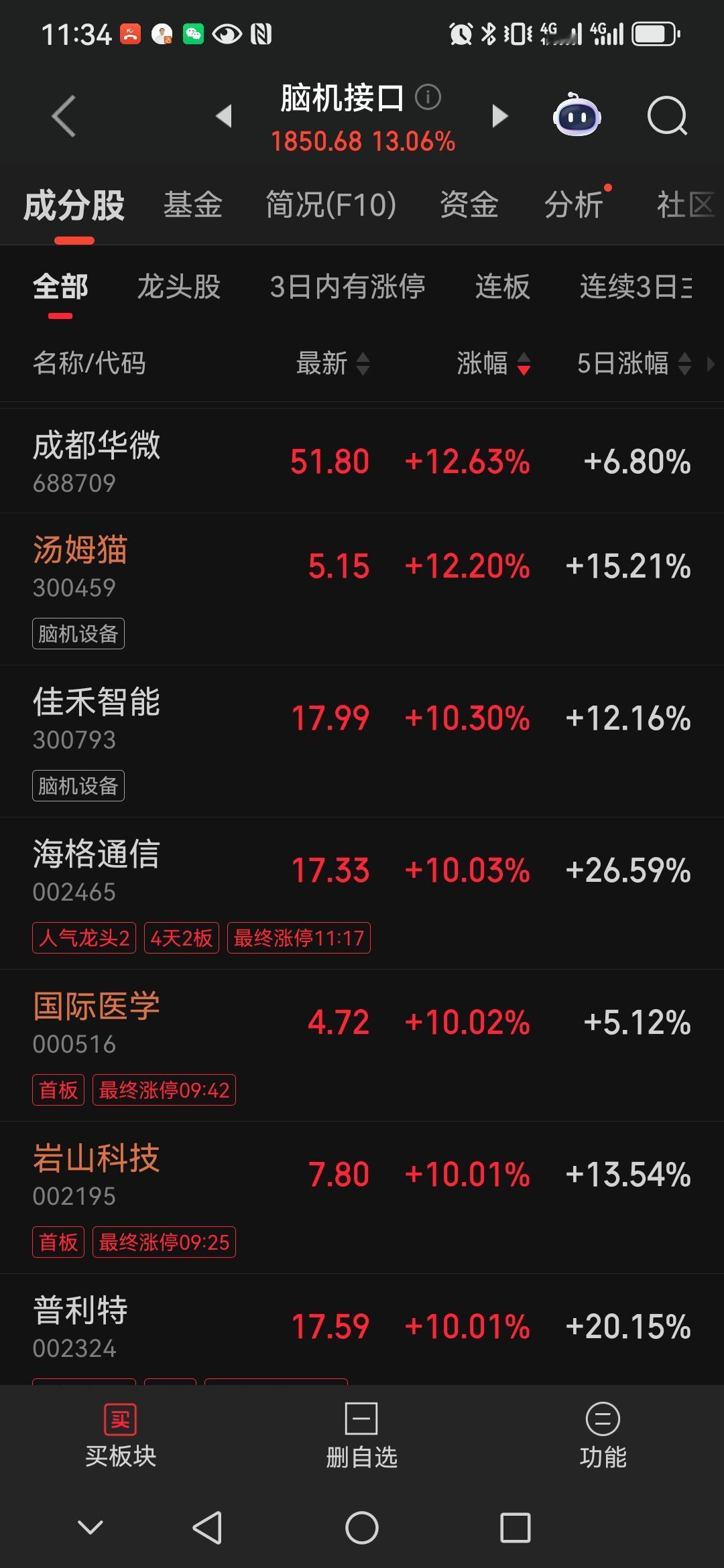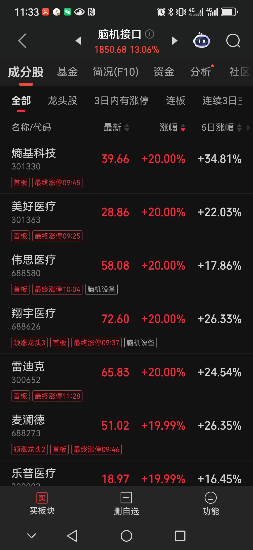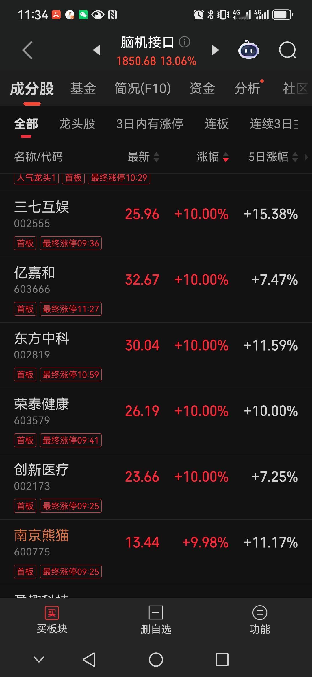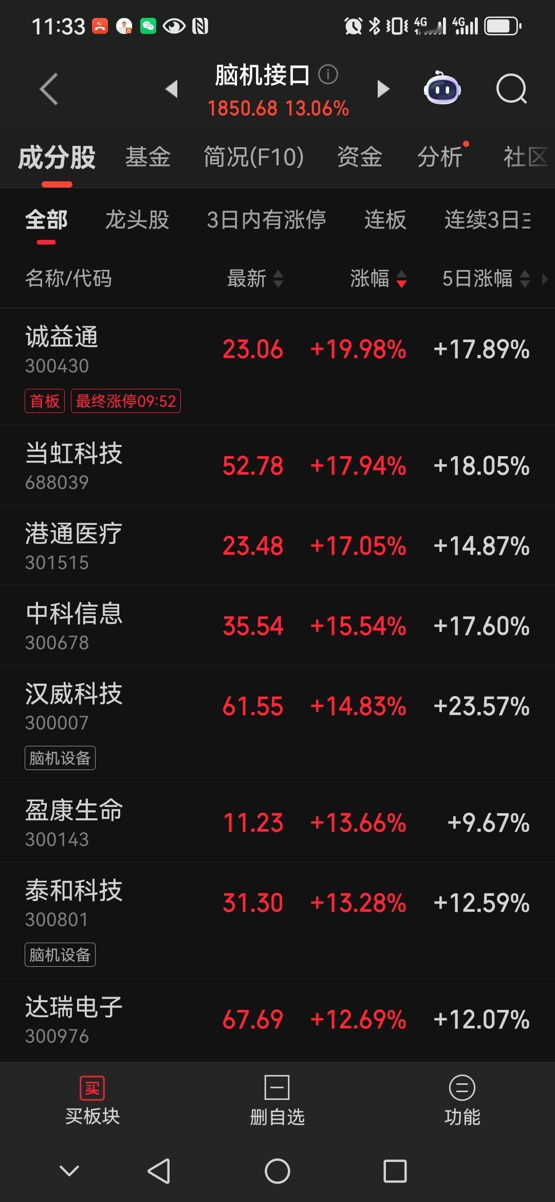 脑机接口板块暴涨,截止午间板块涨超13.06% 消息面上当地时间2025年12月31日,埃隆、马斯克在社交媒体上表示,其脑机 接口公司Neuralink将于2026年开始对脑机接口设备上进行大规模量产,还将在脑机植入的方式上实现创新。 受该消息刺激,A股相关上市公司出现大面积涨停,截止目前脑机接口板块更是涨超13.06%,多达25只左右个股涨停,其它没涨停的都出现大涨好几个点。 涨停或大涨百分之十以上的个股分别是: 倍益康(920199)29.98% 博拓生物(688767)20.01% 道氏技术(300409)20.01% 三博脑科(301293)20.01% 爱朋医疗(300753)20.00% 狄耐克(300884)20.00% 谱尼测试(300887)20.00% 熵基科技(301330)20.00% 美好医疗(301363)20.00% 伟思医疗(688580)20.00% 翔宇医疗(688626)20.00% 雷迪克(300652)20.00% 麦澜德(688273)19.99% 乐普医疗(300003)19.99% 诚益通(300430)19.98% 当虹科技(688039)17.94% 港通医疗(301515)17.05% 中科信息(300678)15.54% 汉威科技(300007)14.83% 盈康生物(300143)13.66% 泰和科技(300801)13.28% 达瑞电子(300976)12.69% 成都华微(688709)12.63% 汤姆猫(300459)12.20% 佳禾智能(300793)10.30% 海格通信(002465)10.03% 国际医学(000516) 岩山科技(002195)10.01% 普利特(002324)10.01% 三七互娱(002555)10.00% 亿嘉和(603666)10.00% 东方中科(002819)10.00% 荣泰健康(603579)10.00% 创新医疗(002173)10.00% 南京熊猫(600775)9.98% 盈趣科技(002925)9.98% 光莆股份(300632)9.96%等 脑机接口板块一片繁荣的景象