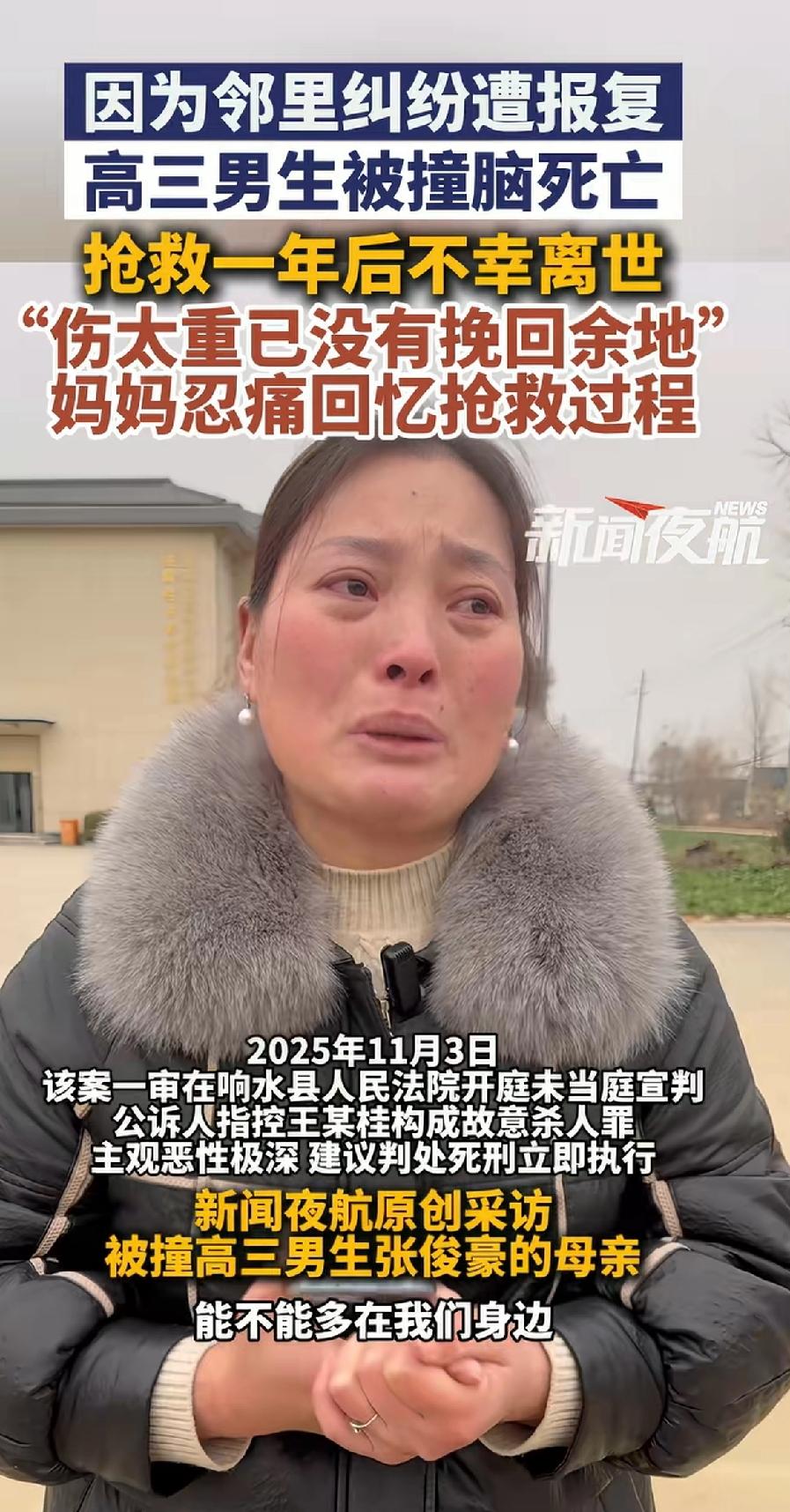邻里纠纷遭报复,高三男生被撞脑死亡,抢救一年后不幸离世。 妈妈哭着诉说抢救过程:“伤的太重已经没有挽回的余地了”。 2024年5月29日,江苏盐城响水县的高三学生张俊豪,在骑电动车上学路上遭遇了噩梦。 邻居王某某因鸡粪堆放、地界问题与张家产生争执,怀恨在心后实施报复,驾车以94 - 95km/h的速度将他撞倒。 张俊豪昏迷14个月后,于2025年7月29日离世。1月5日该案一审宣判,王某某犯故意杀人罪被判死刑立即执行。 虽王某某事发后报警谎称事故,律师称其精神异常,均未被采纳。 张俊豪妈妈说“孩子也回不来了”,多令人痛心。孩子躺在病床上抢救14个月,父母提心吊胆14个月。这一年多被害者家属承担了太多痛苦。 本应冲刺高考的少年,却因邻里纠纷失去生命,邻居高搭墙,想不通每天相处的人怎么会这么坏?因为一点小事就下死手!事后还想尽办法逃避罪行,谎称自己有精神病,试图掩盖犯罪事实。明明是故意杀人,性质恶劣,还试图逃避法律责任。 “精神病”不是罪犯的挡箭牌,不该被犯罪分子利用,好在最后法院公平审判,还受害人和其家属一个公道。