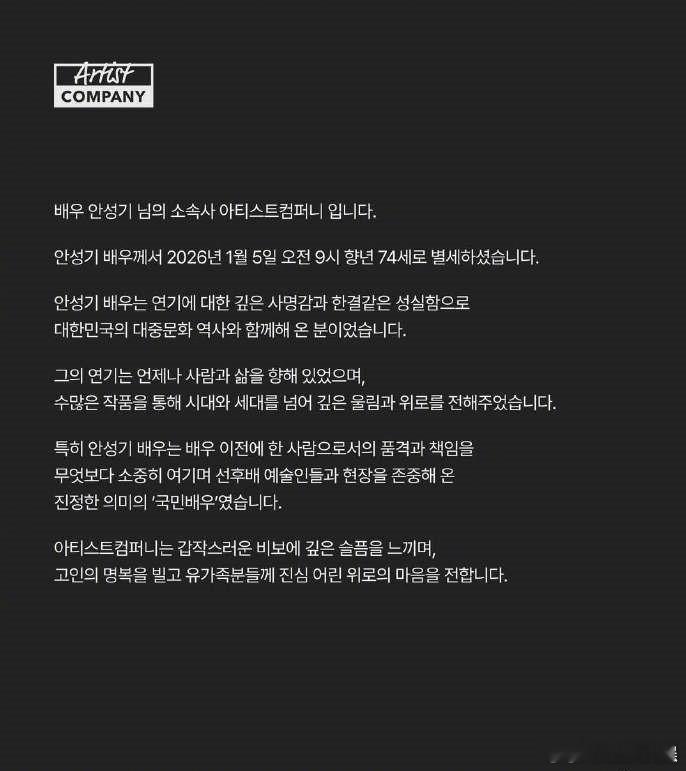演员安圣基去世 1月5日,所属公司发布讣告,宣布演员安圣基去世,享年74岁。据悉,他自2019年起一直与白血病抗争,2025年12月31日被曝病危入院抢救。安圣基曾凭借《铁人们》《雾村》《深蓝色的夜》《成功时代》《南部军》《谁曾见过龙之脚趾》《Two Cops》《广播明星》等作品多次获得百想艺术大赏、韩国电影大钟奖、韩国青龙电影奖最佳男主角。