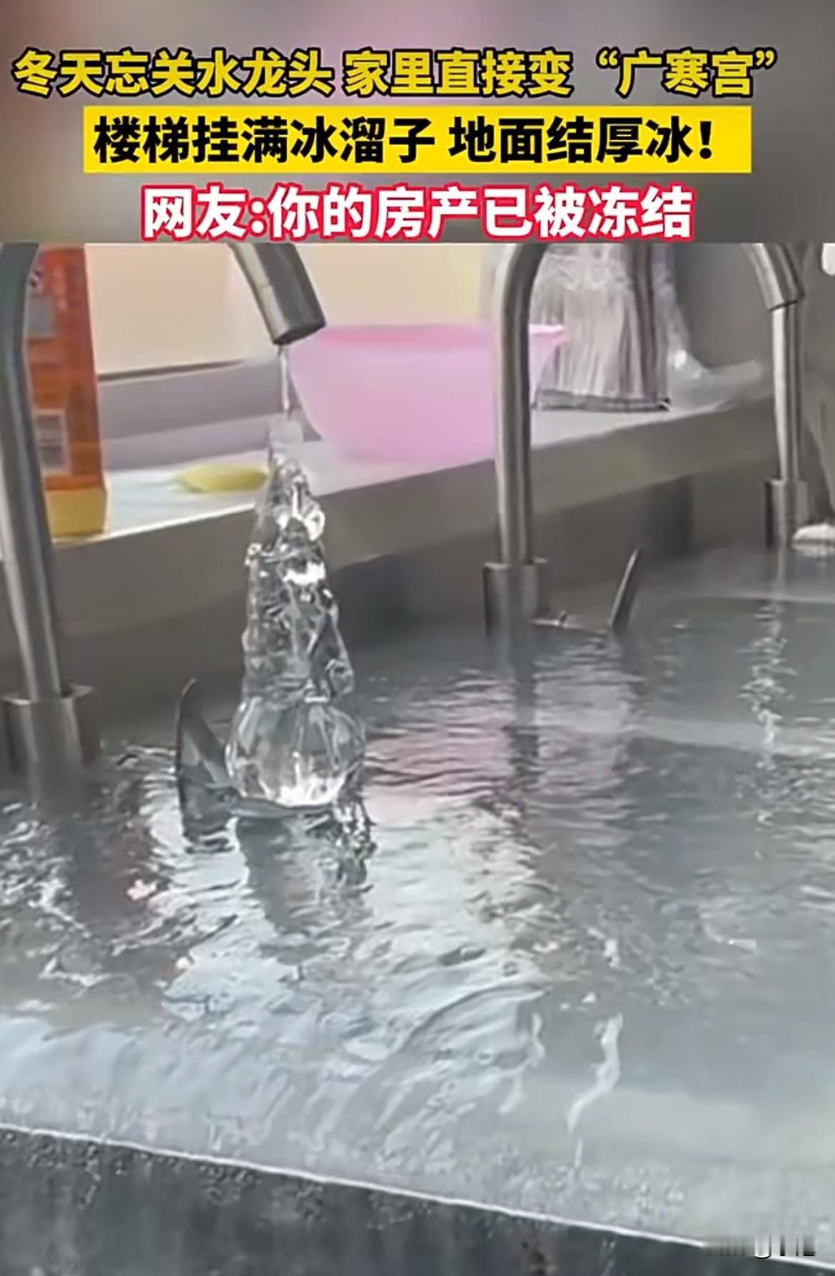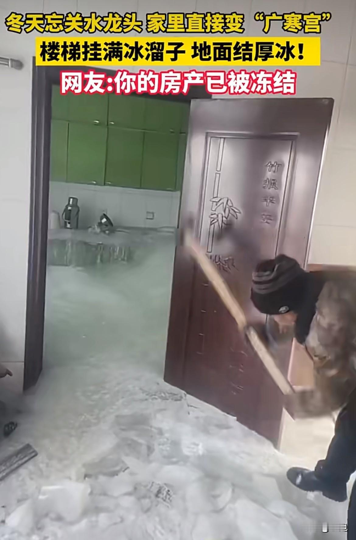 一开门,家里立着一座冰山。 厨房不见了,客厅不见了,所有东西被裹在半米厚的冰里。冰是浑浊的,封着橱柜、水管,还有没来得及收的生活痕迹。这不是电影,是东北一户人家外出后,忘关水龙头的结果。 水怎么就能在家堆成山?首先,家必须冷得和室外一样。这户人家外出,供暖可能停了或坏了,室内温度骤降到零下二十几度。家,瞬间变成冰窟。 然后,科学上演了神奇一幕。水管里的水,在极安静情况下,温度能降到零下十度还不结冰,这叫“过冷”状态。可水一旦流出,碰到水槽、瓷砖,一点灰尘或震动就能引爆结晶。冰晶扩散的速度是惊人的。 最厉害的还在后面。水结冰时,每克都会释放出334焦耳的热量。但这丁点热量,在零下二十度的空气里,杯水车薪。反而像给了信号,让更多的水分子前赴后继地凝固,让冰层疯狂加厚。今天一厘米,明天一厘米,几天就能堆出令人窒息的高度。 冰是有“劲”的。水变成冰,体积要膨胀约9%。这股撑开的力量,足够把金属水管撑裂。也就是说,就算水龙头不漏,水管自己也可能冻裂,然后水漫金山,再结成冰。这是一个恐怖的循环。 这种事绝非孤例。北方冬天,类似场景总在上演。内蒙古有人家里,结出十几厘米厚的“冰地砖”,走路得铺木板。新疆有商铺,漏水到街上冻成冰面,路人接连滑倒。吉林甚至有楼房,因住户长期放水防冻,在楼外挂出了巨大的“冰瀑布”。这些,都是寒冷刻在生活上的刺眼印记。 面对冰山,怎么办?绝对别用热水浇或火烤!冷热剧烈交锋,管道立马爆裂。正确做法是关总阀,然后用三十度左右的温水,慢慢浇淋冻结处。或者用热毛巾包裹,耐心等待。 代价是惨重的。清理需要用专业电镐一点点凿。冰化后,地板、墙面、电器基本全废,维修费数万元起。这还是一个漫长的过程。 奇观背后,是巨大的疏忽。预防其实很简单:外出长期离家,务必关闭自来水总阀,排空管道存水。对暴露的管道,用棉麻织物、泡沫塑料给它“穿棉衣”。极寒夜里,稍微拧开水龙头让水滴成线,流动的水不易冻住。这些小事,关上门就是两个世界。 冰雪可以是浪漫的景,也可以是倾家的灾。那座堵在家里的冰山,像一堵透明的警告墙。它问你,离家前的那一秒检查,真的多余吗?