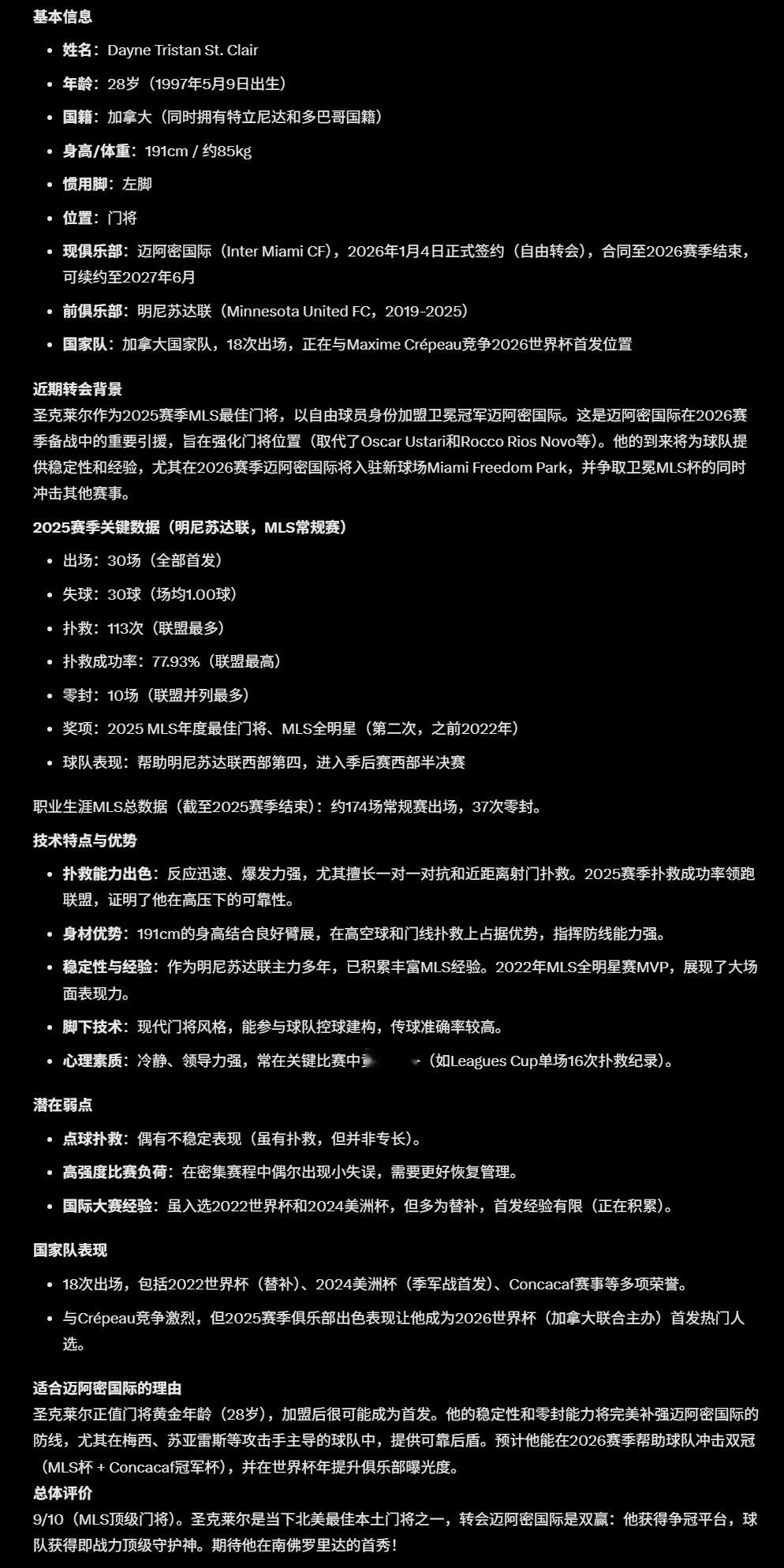 新援➕1️⃣迈阿密国际官方宣布签下加拿大门将戴恩·圣克莱尔,合同有效期至2026年底,并包含2027年过渡赛季(2027年6月)的续约选项。迈阿密国际