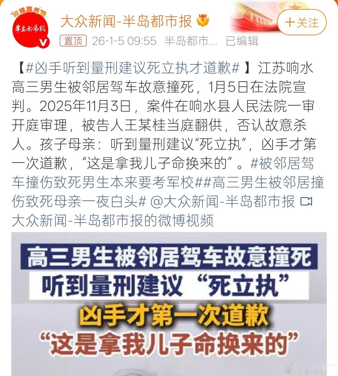 凶手听到量刑建议死立执才道歉“在一审宣判过程中,李健还不时面露微笑,但听到“判处死刑”时,他的脸色陡变。宣判结束后,李健大喊“我要发言”,随即被法警带出法庭。”“整个庭审过程中,余华英态度非常嚣张恶劣,她还是觉得自己没有错。一直到宣判结果出来,她的眼泪掉下来了。”“听到量刑建议“死立执”,凶手才第一次道歉。”果然,无论何时,死刑都是对畜生最有效的震慑!男子驾车蓄意撞死高中生被判死刑