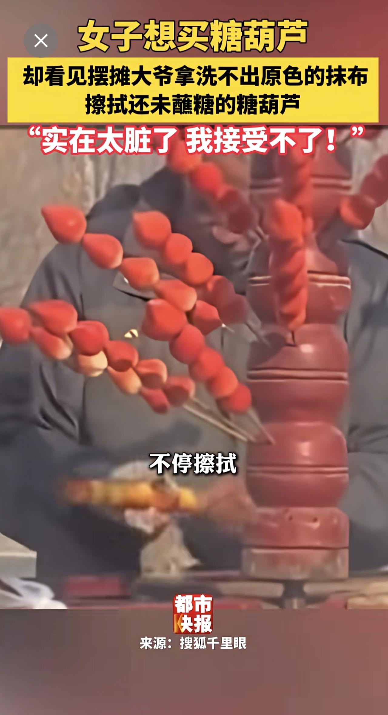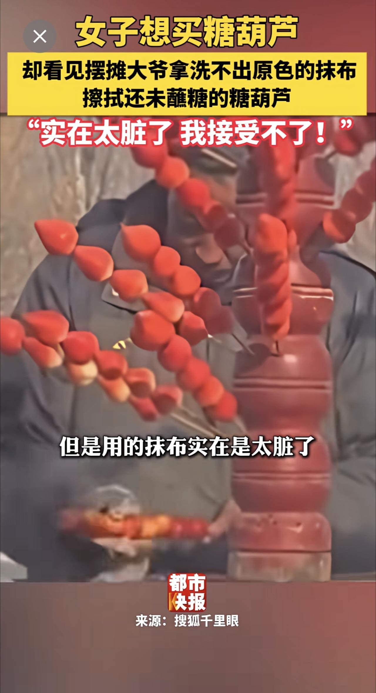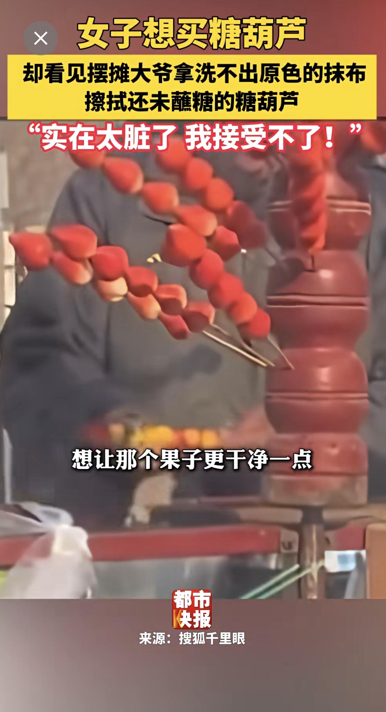 女子想买糖葫芦 却看见摆摊大爷拿洗不出原色的抹布擦拭还未蘸糖的糖葫芦! “实在太脏了 我接受不了!”
