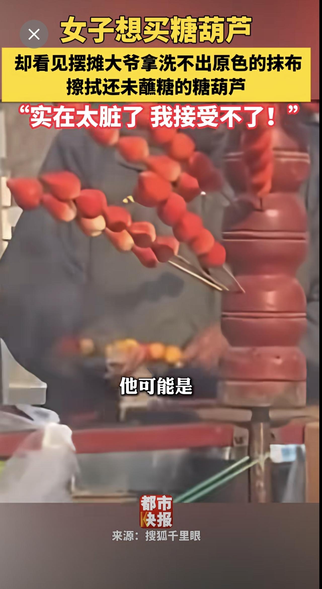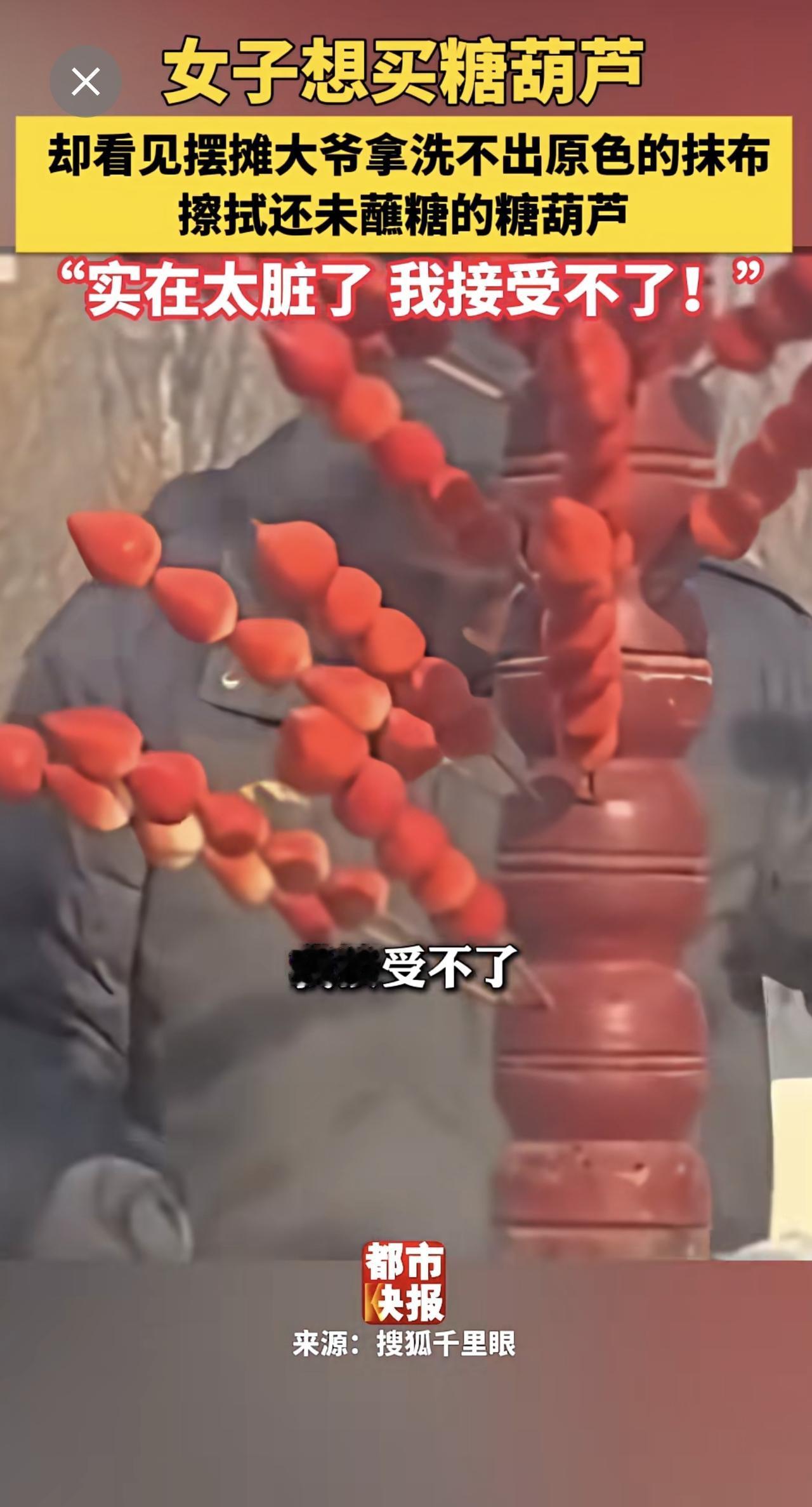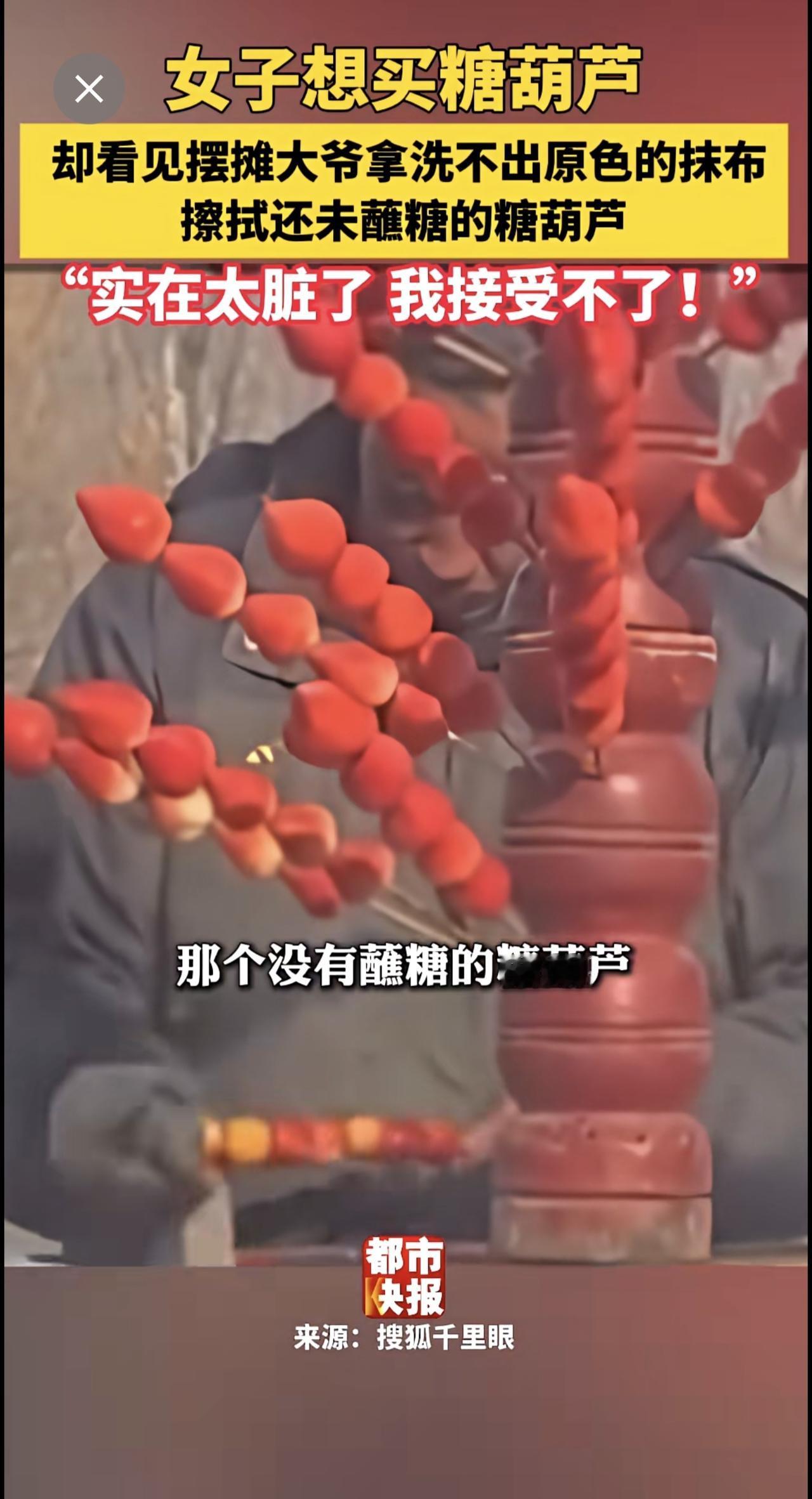 女子想买糖葫芦 却看见摆摊大爷拿洗不出原色的抹布擦拭还未蘸糖的糖葫芦! “实在太脏了 我接受不了!”