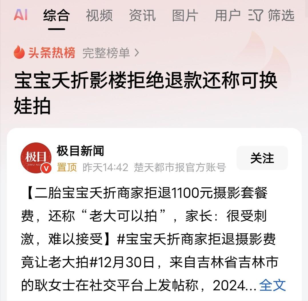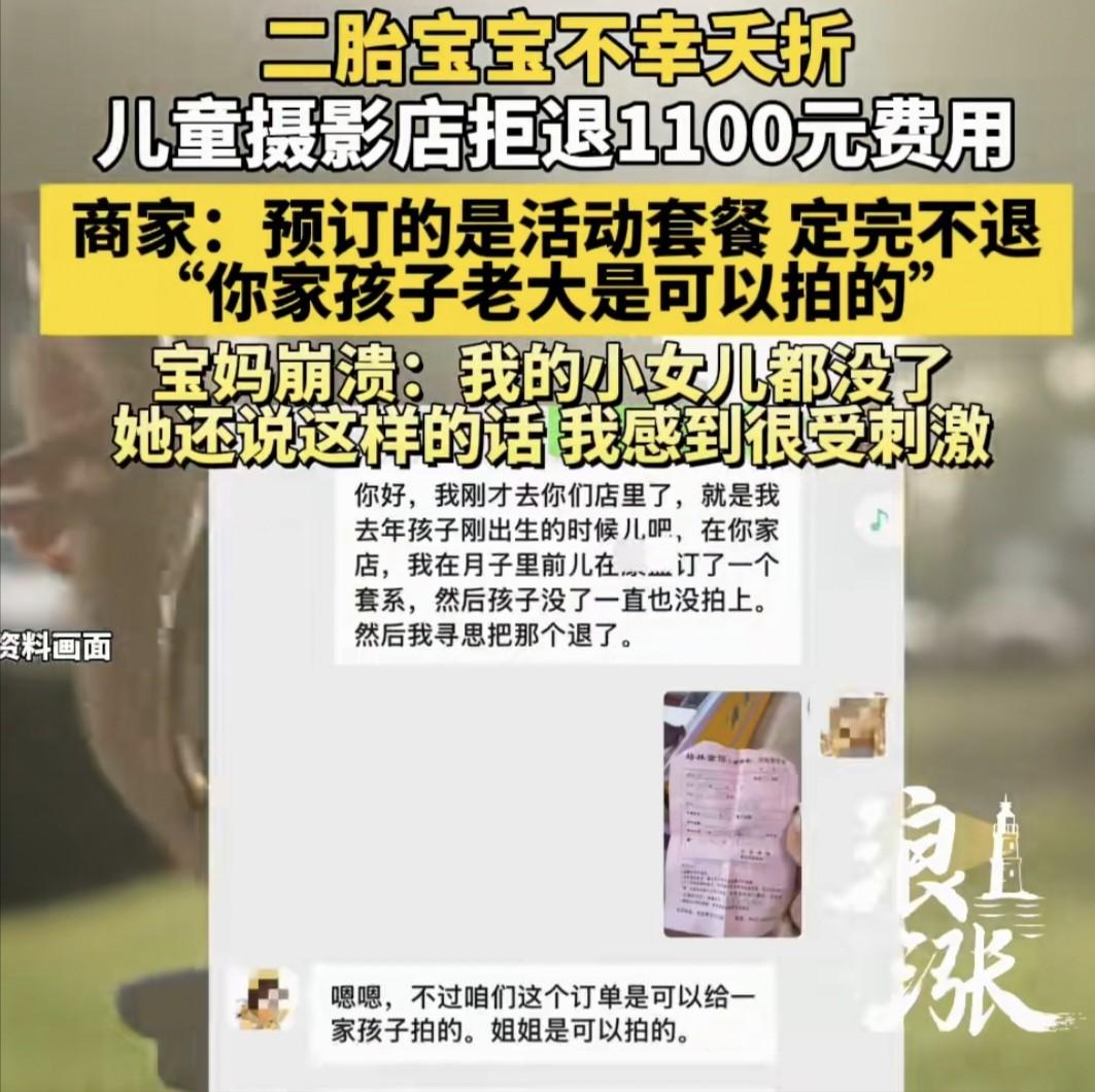 “格局太小?”吉林市,女子在摄影店给刚出生的女儿定了一套宝宝照,花了1100元,数月后,女儿不幸夭折,女子收拾孩子遗物时,发现摄影店的收据,才想起照片一张没拍,便找店家退款,不料,店家不但不退,还说可以让女子的大女儿来拍照,女子崩溃:我小女儿都没了,她说这话,我感到很受刺激,可接下来事情的发展,让女子更加无法接受。 王女士的小女儿降临后,她满心欢喜地规划着孩子的成长纪念。在一家儿童摄影店工作人员的推荐下,她毫不犹豫地花1100元订了一套包含百天照和周岁照的宝宝照套餐,想着用镜头记录下女儿成长的珍贵瞬间。 当时工作人员热情地承诺,后续会提前联系她预约拍摄时间,王女士满心期待着和女儿的第一次正式合影。 可命运却给这个家庭浇了一盆冷水。小女儿出生几个月后,突然被诊断出严重疾病,尽管王女士和家人拼尽全力带孩子治疗,最终还是没能留住这个幼小的生命。 那段时间,王女士沉浸在巨大的悲痛中,整日以泪洗面,根本无暇顾及其他事情,预订宝宝照的事也被彻底抛在了脑后。 在整理小女儿遗物时,一张被压在抽屉角落的收据掉了出来,王女士拿起一看,才猛然想起给小女儿订的宝宝照还一张都没拍。看着收据上“百天照+周岁照”的字样,再想到再也没有机会给女儿拍摄,她的眼泪瞬间涌了出来。 平复了许久的情绪,王女士抱着试试看的心态,联系了当初预订套餐的摄影店,说明情况后希望能退还未消费的1100元费用。 让王女士没想到的是,听到退款请求后,摄影店工作人员的态度瞬间冷了下来,直接以“套餐是活动款,单据上写明定完不退”为由拒绝了她的请求。 王女士急忙解释,不是自己主观不想拍,而是孩子已经不在了,这个套餐根本没有办法再使用,希望店家能通融一下。 更让王女士崩溃的是,工作人员接下来的一句话,像一把刀子扎进了她的心里。对方轻飘飘地提出,既然小女儿没办法拍了,不如让她的大女儿来拍摄这套照片,套餐内容完全可以照常使用。 听到这话的瞬间,王女士的情绪彻底失控,丧女的悲痛和被冒犯的愤怒交织在一起,让她几乎说不出话来。在她看来,这套照片是专门为小女儿准备的纪念,店家的提议不仅无视她的痛苦,更是对逝去孩子的不尊重。 情绪平复后,王女士再次和摄影店沟通,明确表示无法接受这样的提议,坚持要求退款,可对方的态度十分坚决,无论她怎么解释,都不肯松口。 无奈之下,王女士只能向12315投诉平台反映情况,希望通过官方渠道维护自己的合法权益。投诉受理后,相关部门工作人员很快联系了王女士,告知她案件已交由当地市场监管部门处理,让她耐心等待调解结果。 本以为有监管部门介入,事情能得到合理解决,可接下来的沟通却让王女士更加无法接受。摄影店老板通过监管部门转达,愿意退还500元, 但前提是王女士必须删除此前在社交平台分享自己遭遇的帖文。在老板看来,王女士的分享影响了店铺的声誉,只有删除帖文,才能给出这样的“让步”。 这样的附加条件,让王女士感到无比愤怒。她认为自己只是合理维权,分享经历也是希望得到公正对待,店家不仅没有丝毫歉意,还试图用部分退款来压制她的合理诉求。 在监管部门的再次协调下,双方最终达成一致,摄影店当场向王女士退还1000元,王女士也按照约定修改了社交平台的帖文内容。 对于家长来说,给孩子订成长照是满满的爱与期待,而当这份期待因意外落空时,更需要商家的理解与体谅。一场本可妥善解决的退款纠纷,却因商家的冷漠态度步步升级。 生意的本质是诚信与温度,灵活处理特殊情况,不仅不会损失什么,反而能赢得更多人的认可。对此,你们有什么看法,欢迎评论留言~