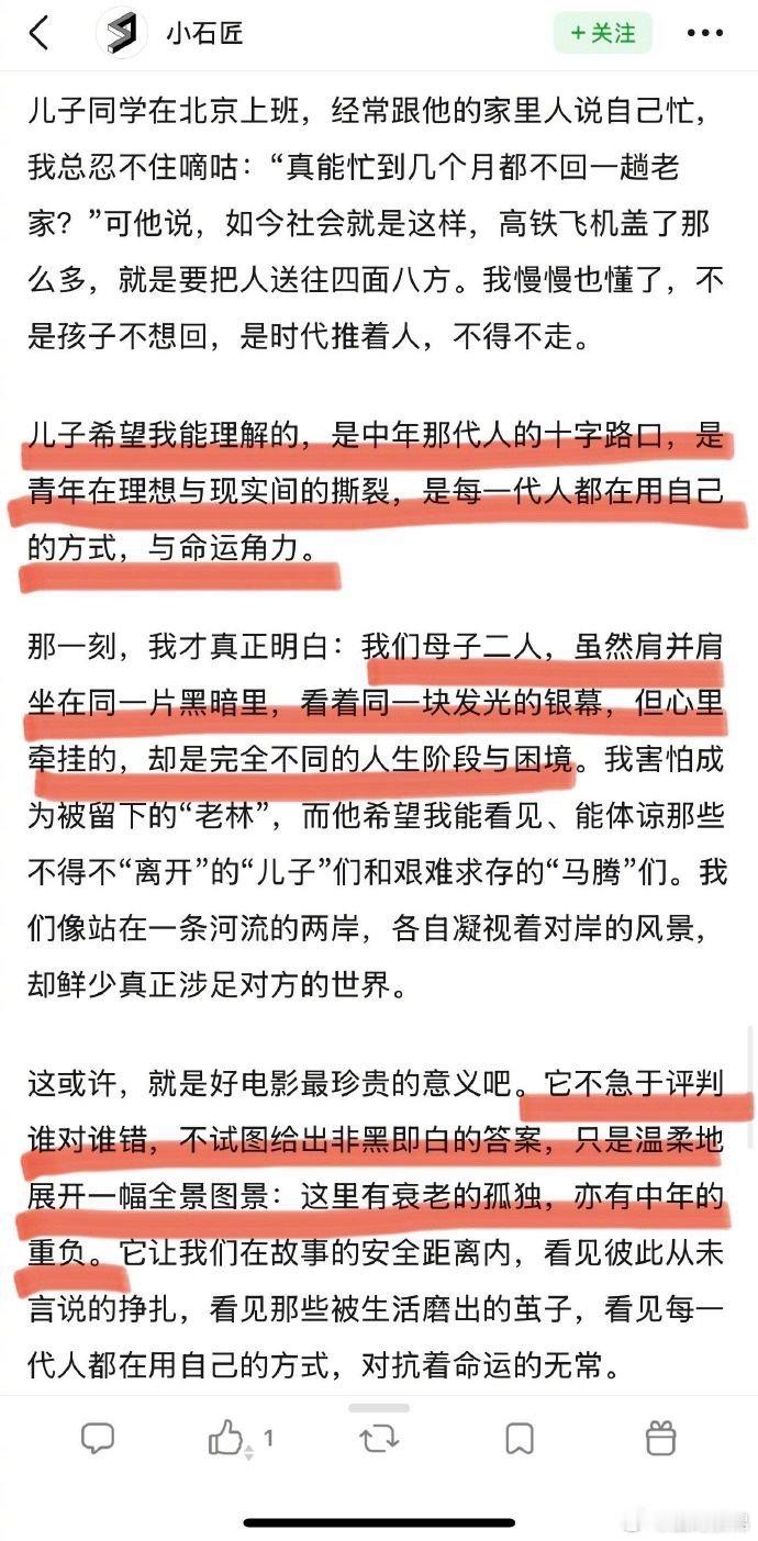 退休阿姨千字长文戳我泪腺 从阿姨的影评里,提前感受到《马腾你别走》的温度。它让我们看见长辈的盼与怕,也教会我们,陪伴才是最好的沟通。
