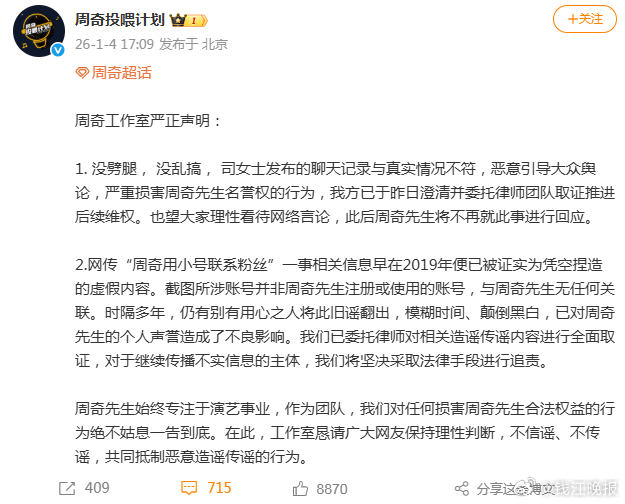 【周奇向涵之被曝恋情?向涵之经纪公司回应:单身,在赶工】周奇 向涵之#恋情,称2025年12月17日,向涵之拖着行李去周奇家里,18日,两人收工后与朋友聚会到凌晨,周奇帮向涵之背包,二人门口拥抱,两人一起回家。周奇向涵之被曝光恋情后,司晓迪又晒出大段和周奇的聊天记录,质问对方“和向涵之在一起干嘛还要找我。”随后,周奇工作室严正声明:1. 没劈腿, 没乱搞, 司女士发布的聊天记录与真实情况不符,恶意引导大众舆论,严重损害周奇先生名誉权的行为,我方已于昨日澄清并委托律师团队取证推进后续维权。也望大家理性看待网络言论,此后周奇先生将不再就此事进行回应。2.网传“周奇用小号联系粉丝”一事相关信息早在2019年便已被证实为凭空捏造的虚假内容。截图所涉账号并非周奇先生注册或使用的账号,与周奇先生无任何关联。时隔多年,仍有别有用心之人将此旧谣翻出,模糊时间、颠倒黑白,已对周奇先生的个人声誉造成了不良影响。我们已委托律师对相关造谣传谣内容进行全面取证,对于继续传播不实信息的主体,我们将坚决采取法律手段进行追责。向涵之,2002年5月4日出生,华语影视女演员。作品有《启航:当风起时》《小敏家》《我的秘密室友》《定风波》《大生意人》等。周奇,2000年10月10日出生于,毕业于北京电影学院2020级表演实验班,中国内地影视男演员。电视剧《芈月传》《恋人的谎言》《苍茫的天涯是我的爱》《藏海传》《长安二十四计》等。(潮新闻记者 刘睿阳综合)