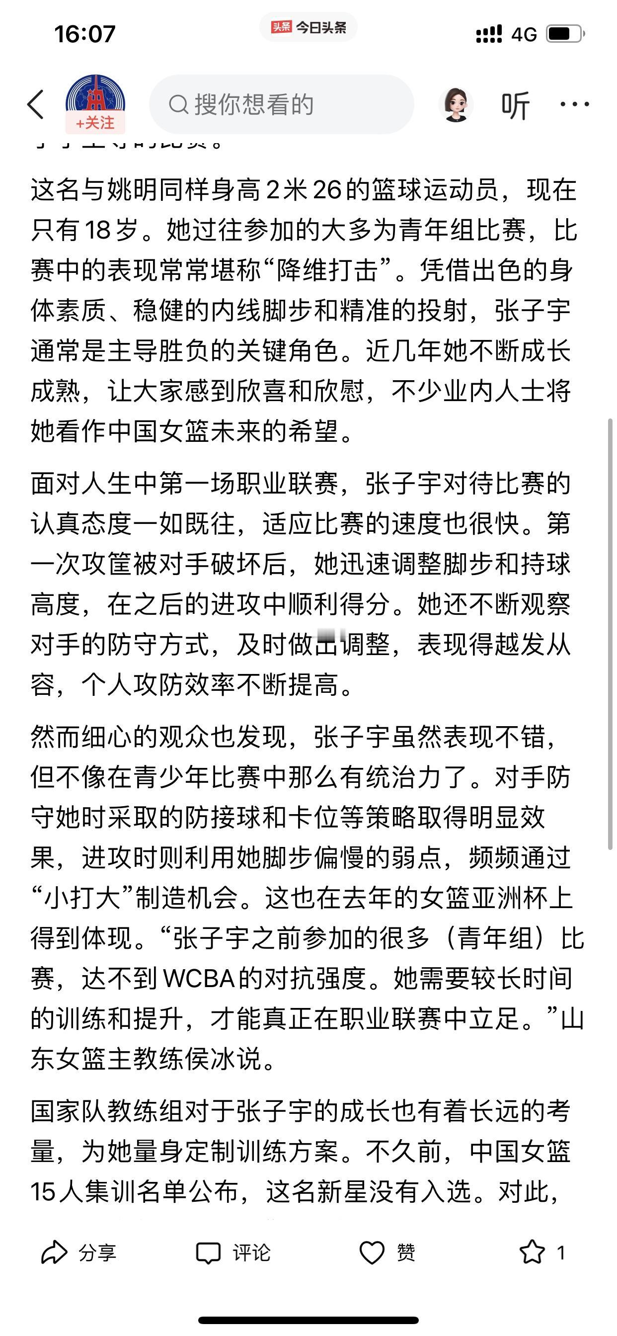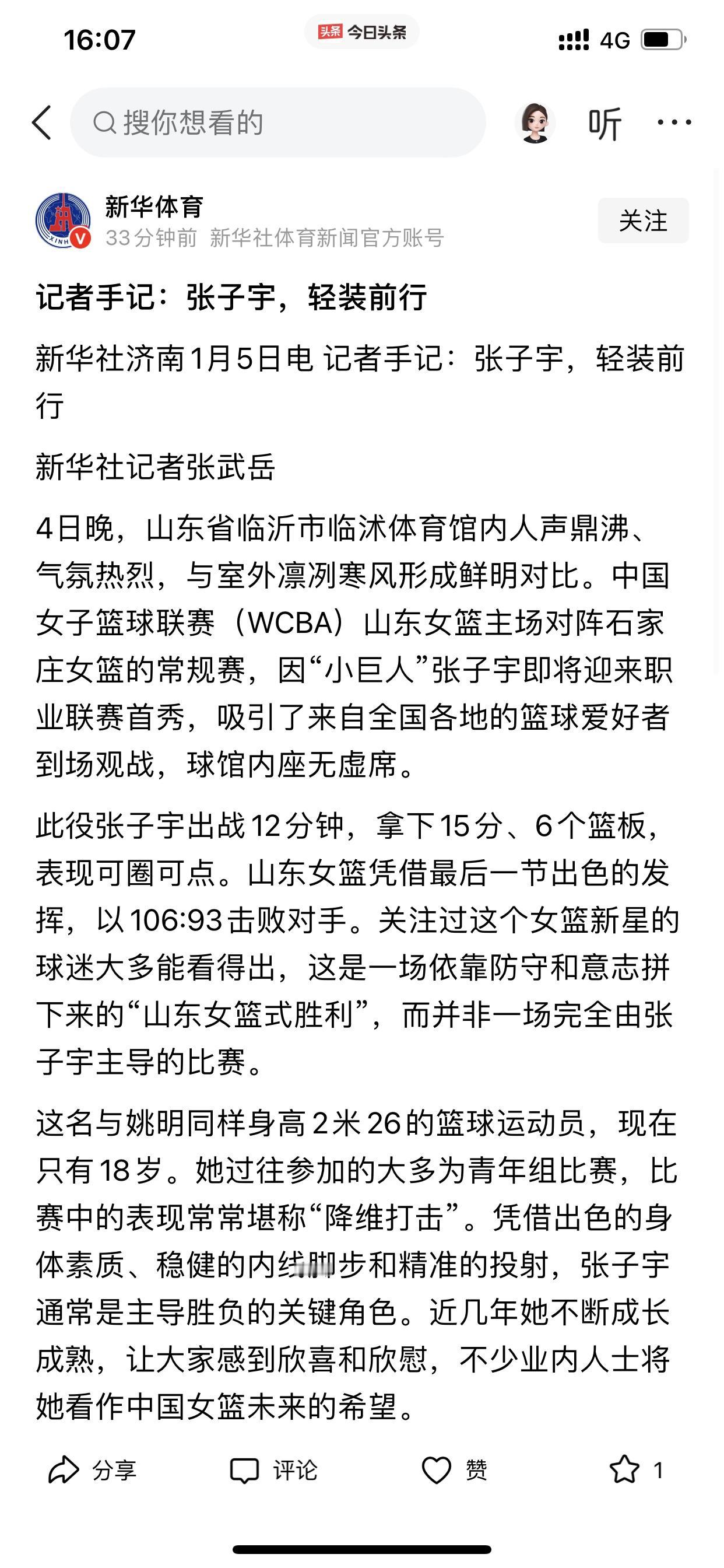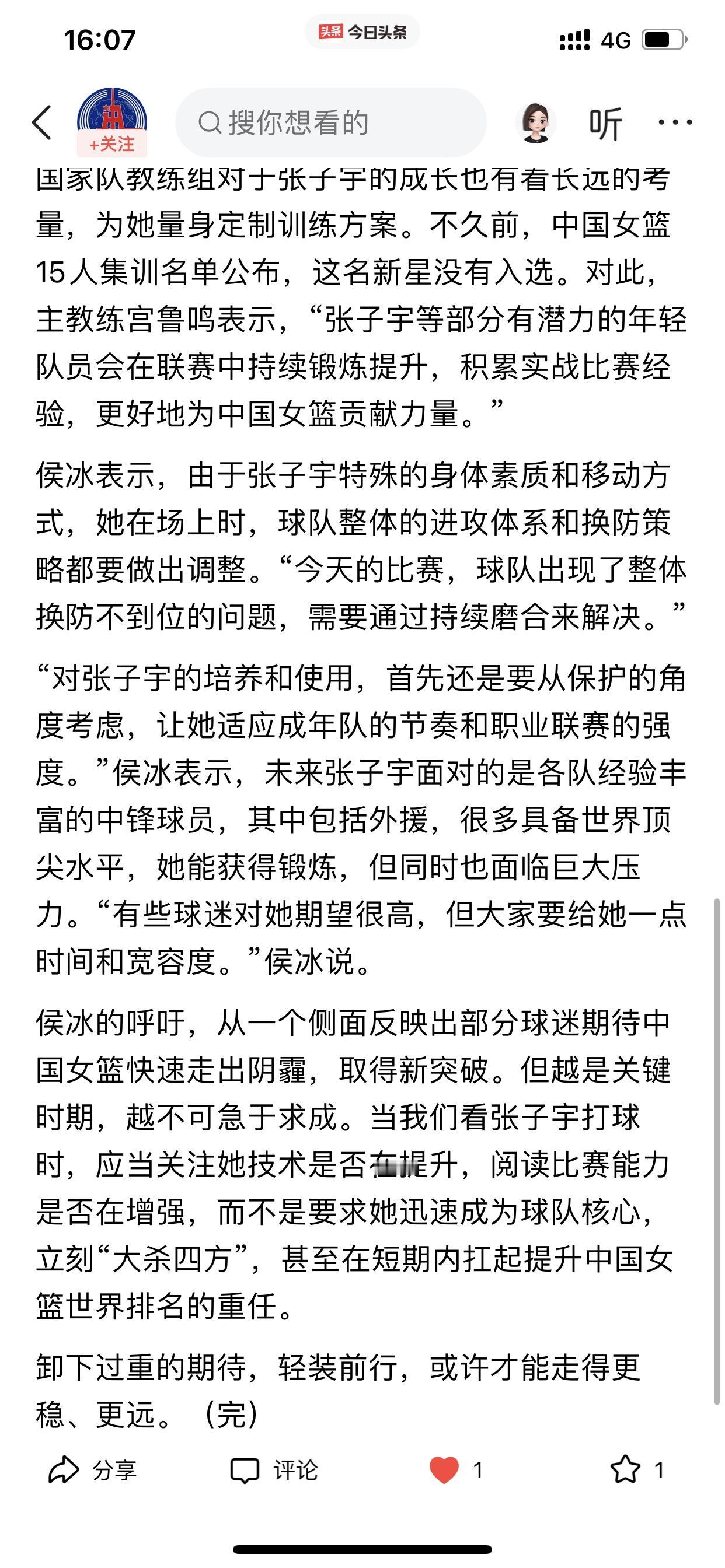 新华社对张子宇说卸下过重期待,轻装前行! 对此,我觉得新华社这话说的太好了! 张子宇毕竟才是一个19岁的女孩,虽然已经成年了,但说她她还是一个孩子也不算过分! 所以,如果把中国女篮重新走向辉煌的担子寄托在现在的张子宇的身上,是不科学的 通过昨晚的比赛,张子宇也是证明了自己,作为一个第一次打职业比赛的女篮运动员,12分钟时间里,斩获15分和6个篮板,这个数据已经是非常亮眼的表现 但从整体来看,也说明了张子宇就是需要联赛的磨练 因此,新华社这话既是说给张子宇听的,也是说给我们这些期待张子宇的观众听的! 平常心对待,静静地看着张子宇稳稳的成长即可!