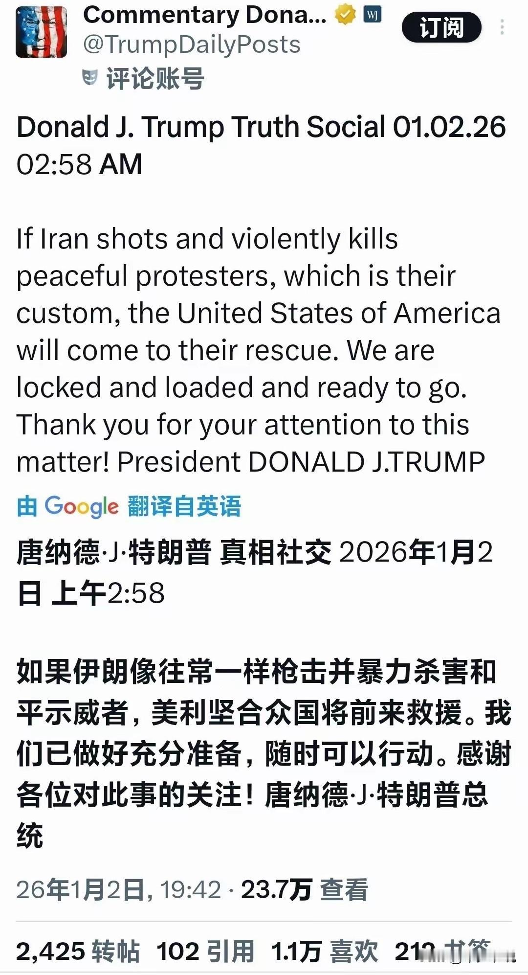 管的真宽,特朗普威胁伊朗敢镇压示威美国就出兵 特朗普通过社交媒体警告伊朗“如果敢镇压示威游行就对伊朗出兵”,特朗普还真是把自己当成世界警察了,先不说伊朗的示威游行和骚乱是伊朗内政,就说伊朗镇压示威游行关特朗普什么事。