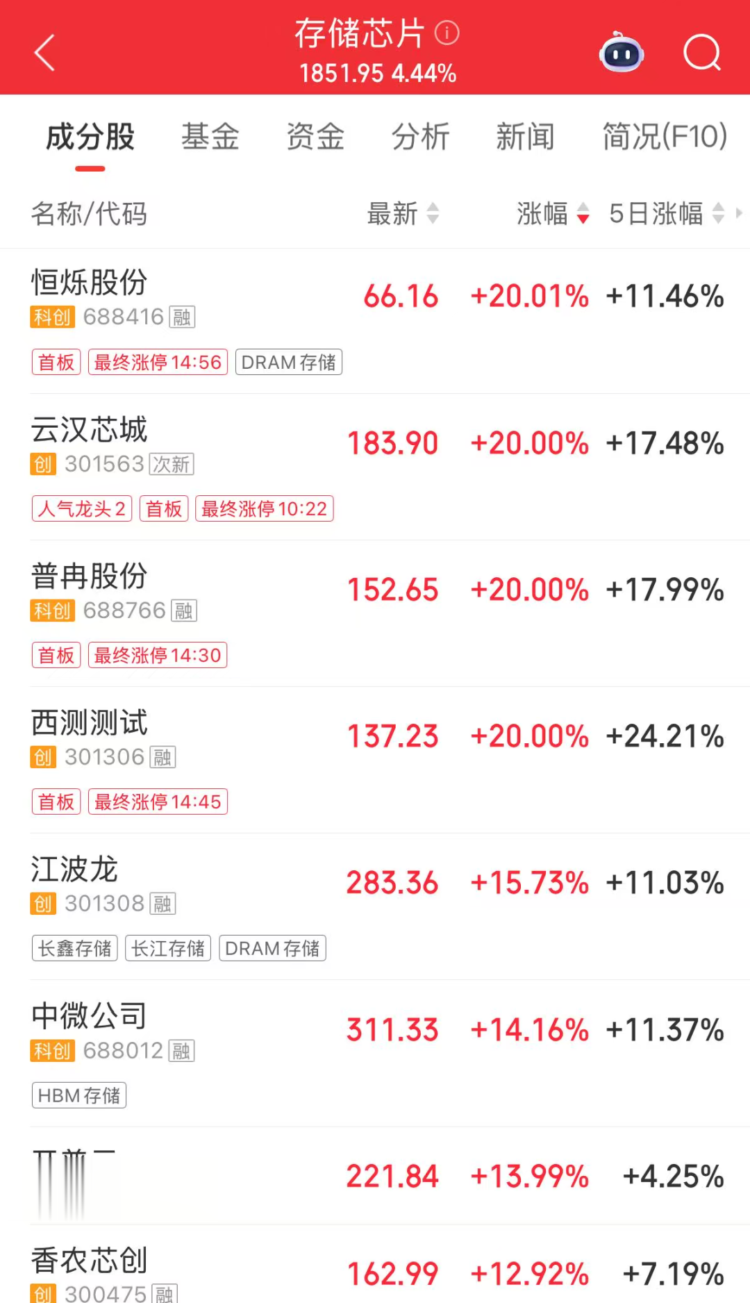 今日,存储芯片板块持续拉升,恒烁股份、云汉芯城、普冉股份、西测测试“20CM”涨停,兆易创新涨停。开普云、江波龙、中微公司等涨幅居前。