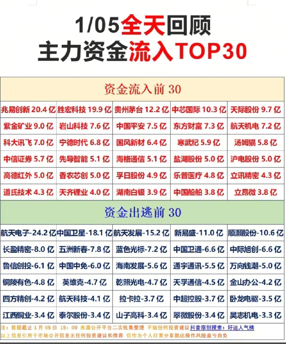 1月5号,周一A股主力资金流入流出一览表!!! 兆易创新主力资金大幅流入20.4亿,后市值得高看一眼;胜宏科技主力资金大幅流入19.9亿,后市值得期待;航天电子主力资金大幅流出24.2亿,后市需注意风险;中国卫星主力资金大幅流出超18亿,后市需小心谨慎操作!!!