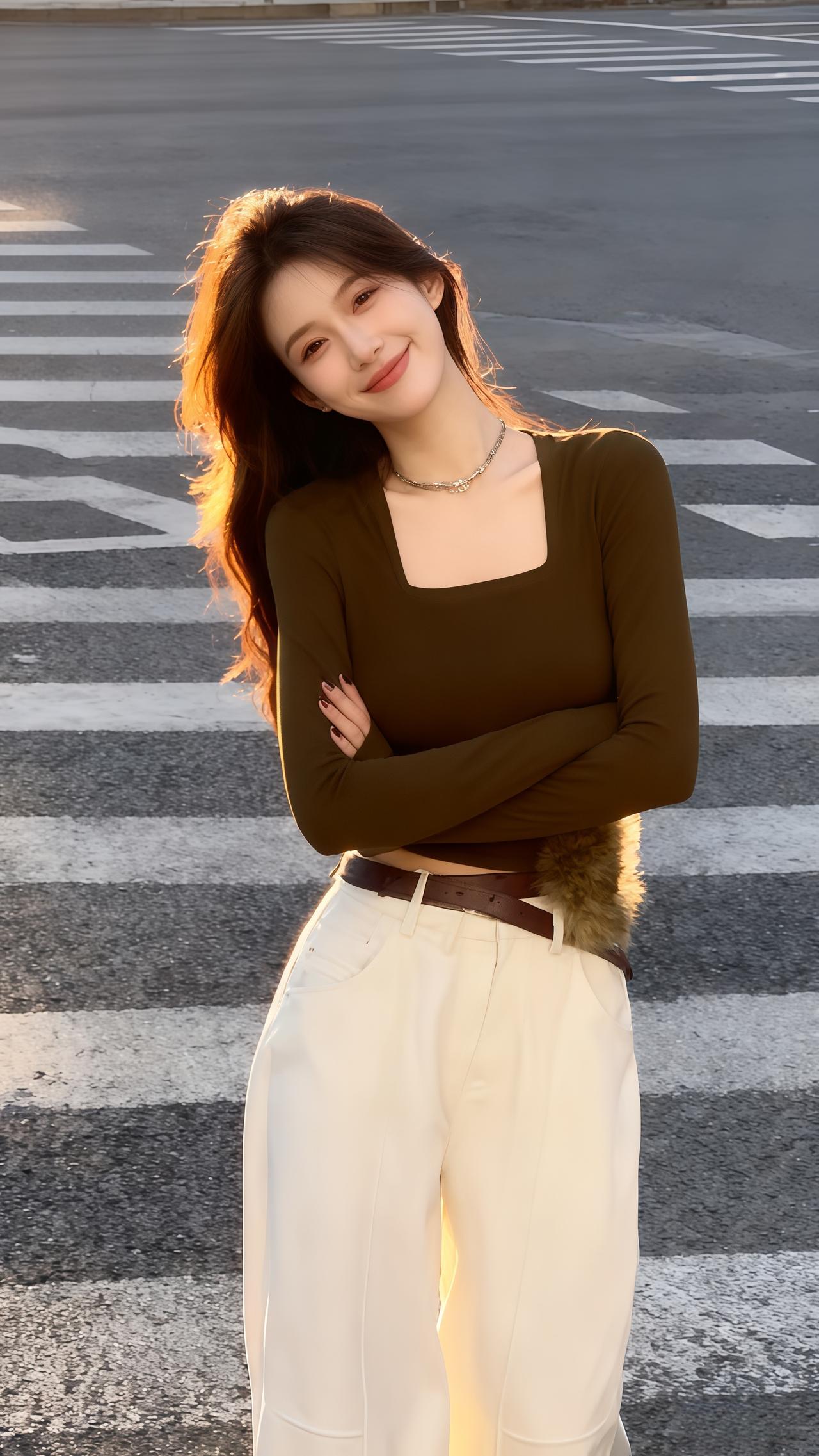 每日穿搭完美身材时尚穿搭米色针织开衫柔化了街头的随性,内搭黑色抹胸露出利落腰线