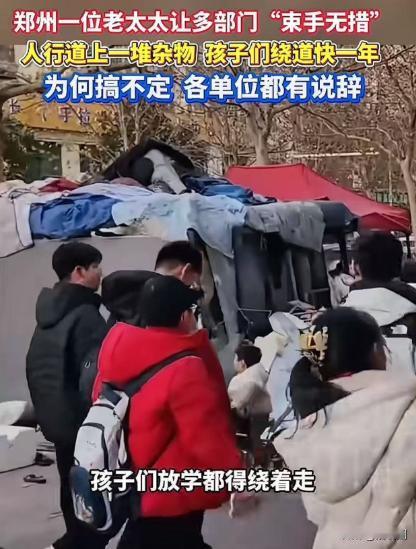 郑州,一位老太太竟然让多个部门束手无策!老太太用帐篷和捡来的各种废品杂物长期占据小区外的人行街道,小区居民多次投诉,有关部门却不敢管。执法部门则表示,老人情况特殊,有精神问题,年纪也大了,强制不合适,只能慢慢协调…… 在郑州某老小区外的人行街道上。一位年近七旬的老太太,常年在该路段搭起帐篷,四周堆满从各处捡来的废品、破旧家具、塑料瓶、纸壳、铁器杂物,甚至还有腐烂变质的生活垃圾。 久而久之,原本宽敞的人行道,被挤得只剩下一条狭窄的“缝隙”,行人不得不绕行机动车道,安全隐患极大。 更让周边居民头疼的是,这种情况并非一两天,而是持续了多年。 小区居民表示,老太太所占据的位置,正好在小区出入口附近。每天上下班高峰期,老人、孩子、推婴儿车的居民都要在杂物间穿行,一旦下雨,地面污水横流,气味刺鼻。 “夏天根本不敢开窗,一股酸臭味。” “晚上回家都害怕,帐篷旁边堆的东西太多了,万一起火,谁负责?” “人行道被占了,孩子只能走马路边,真的很危险。” 居民并非没有尝试解决。有人多次拨打城管热线,有人找过街道办,也有人找物业反映情况。然而,得到的答复却一次比一次让人失望。 物业方面的回应很明确:“老太太搭帐篷的位置在小区外,是公共道路,不属于物业管理范围,我们没有执法权,也不敢动。” 这句话,听起来似乎合情合理,却也成了问题长期得不到解决的第一道“挡箭牌”。 既然是公共区域,居民自然把希望寄托在相关职能部门身上。 在媒体介入后,执法部门给出了回应: 老太太年纪较大,疑似存在精神方面的问题,且生活困难,属于“特殊人群”。如果强制清理,可能引发不可控风险,也容易引发舆情。因此,目前只能以劝导、协调为主。 这番表态一出,事件迅速登上热搜。 不少网友发现,问题的关键并不在于“有没有同情心”,而在于——公共秩序是否可以被无限让步? 评论区迅速分成两派,但情绪异常激烈。 一部分网友表示理解执法部门的为难:“老人确实可怜,万一出事谁担责?” “她可能也没地方去,清走了又能去哪?” 但更多网友一针见血地指出了问题的核心: “法律面前人人平等,不能因为年纪大,就变成‘法外之人’。” “公共道路是大家的,不是谁嗓门大、年纪大、问题多就能长期霸占。” “今天是老太太,明天是不是谁都可以在马路上搭帐篷?” “同情是情感,管理是责任,不能混为一谈。” 有网友直言:“真正的不公平,是守规矩的人一再退让,而违规者却被无限包容。” 事件讨论逐渐从“该不该清理”,转向了一个更现实的问题——社会治理的兜底机制在哪里? 如果老太太确实存在精神问题,那是否应该由民政、社区、医疗系统介入? 如果生活困难,是否可以通过救助、安置解决? 如果长期占道,是否应该在保障其基本权益的前提下,恢复公共秩序? 不少网友指出,如今最令人焦虑的,不是“管得严”,而是“没人敢管”。 一旦“年纪大”“情况特殊”成为万能理由,规则就会失去边界,执法就会陷入瘫痪。最终,付出代价的,往往是普通市民的安全、环境和尊严。 这起郑州老太太占道事件,看似是一个“棘手个案”,实则折射出城市治理中的普遍难题。 我们需要同情弱者,但更需要制度来保护所有人; 我们可以慢慢协调,但不能无限拖延; 我们强调人性化执法,但不能以牺牲公共利益为代价。 正如一位网友所说: “真正文明的社会,不是没人管,而是既有温度,也有边界。” 这件事,或许不该再被一句“情况特殊”轻轻带过。