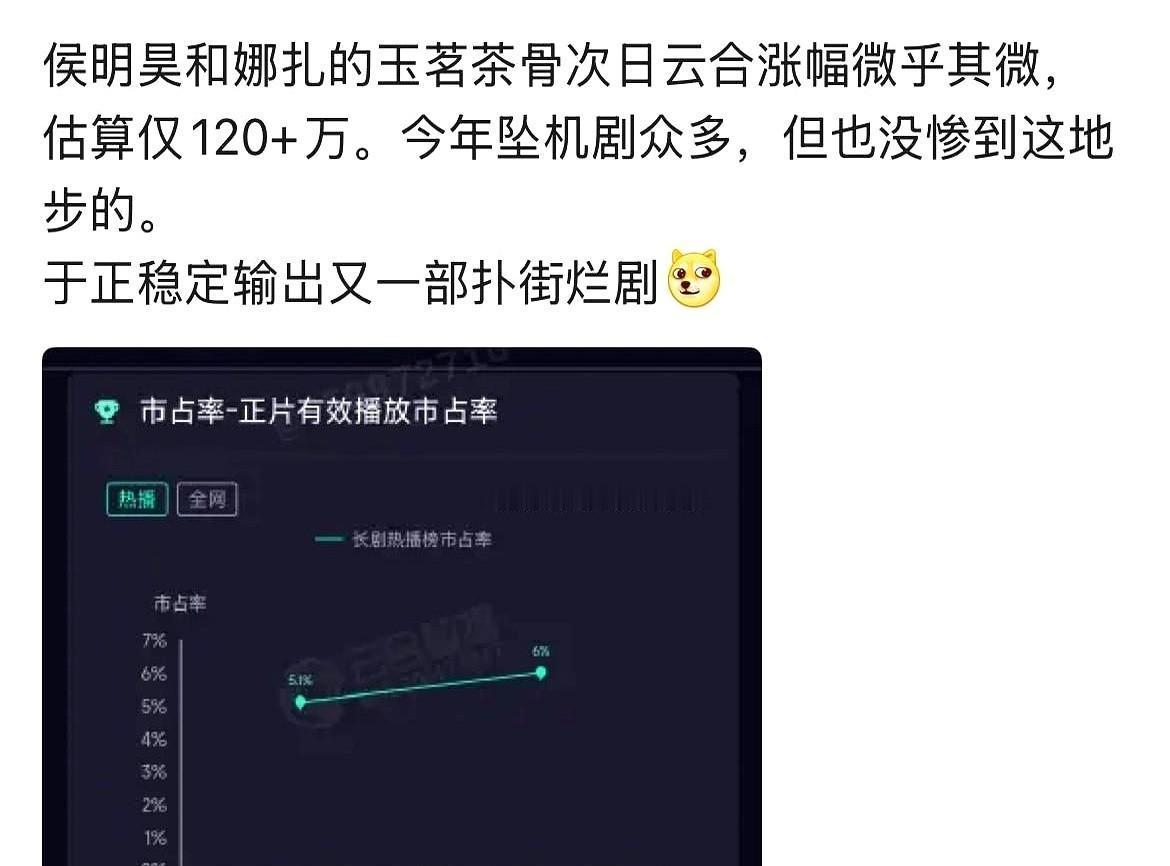 于正这次真翻车了! 《玉茗茶骨》开播即扑,云合数据次日6%,第三天仅涨0.9%,这哪是爆款,简直是哑炮。 我圈内朋友都在说,这剧开播前侯明昊和娜扎那场发布会,两人互动僵硬得像在念悼词,CP感为零,观众还没看剧心就凉了半截。 更离谱的是,于正亲自上阵演女二她爹,给自己疯狂加戏,甚至直接向女主提亲。 这到底是拍戏还是给自己圆梦? 豆瓣4.8分! 这可是于正近年最低分。 制作周期仅5个月,为了赶档期粗制滥造,剧情逻辑稀碎,演员演技集体掉线。 一部剧要是成了编剧的自恋秀,观众凭什么买单?