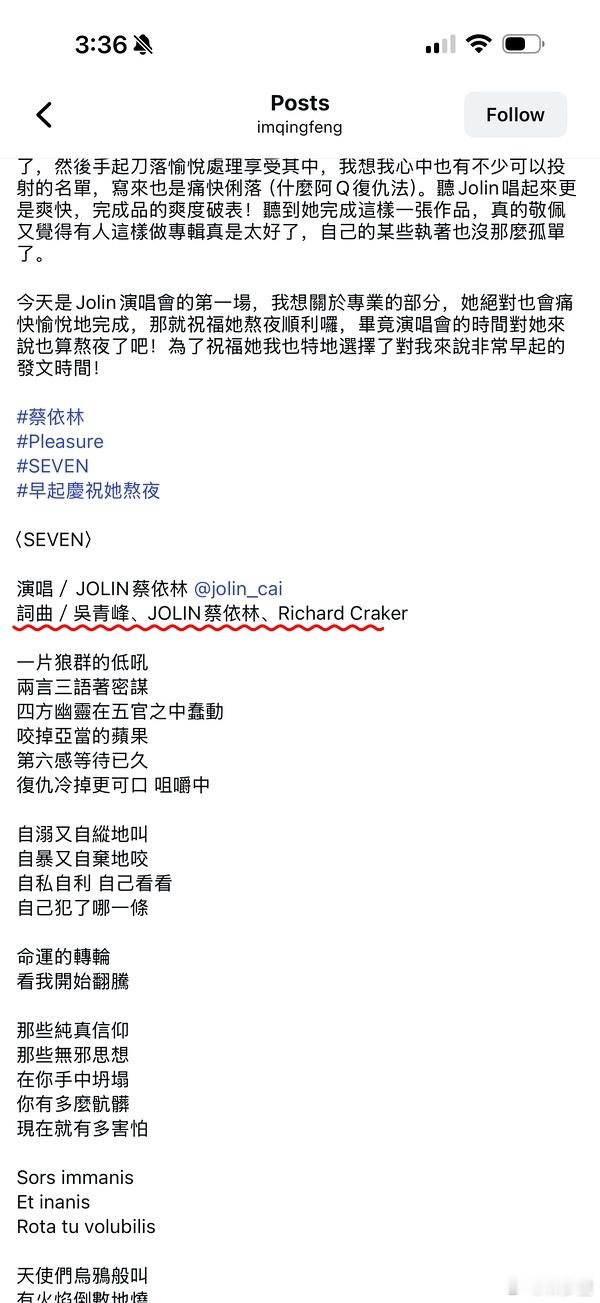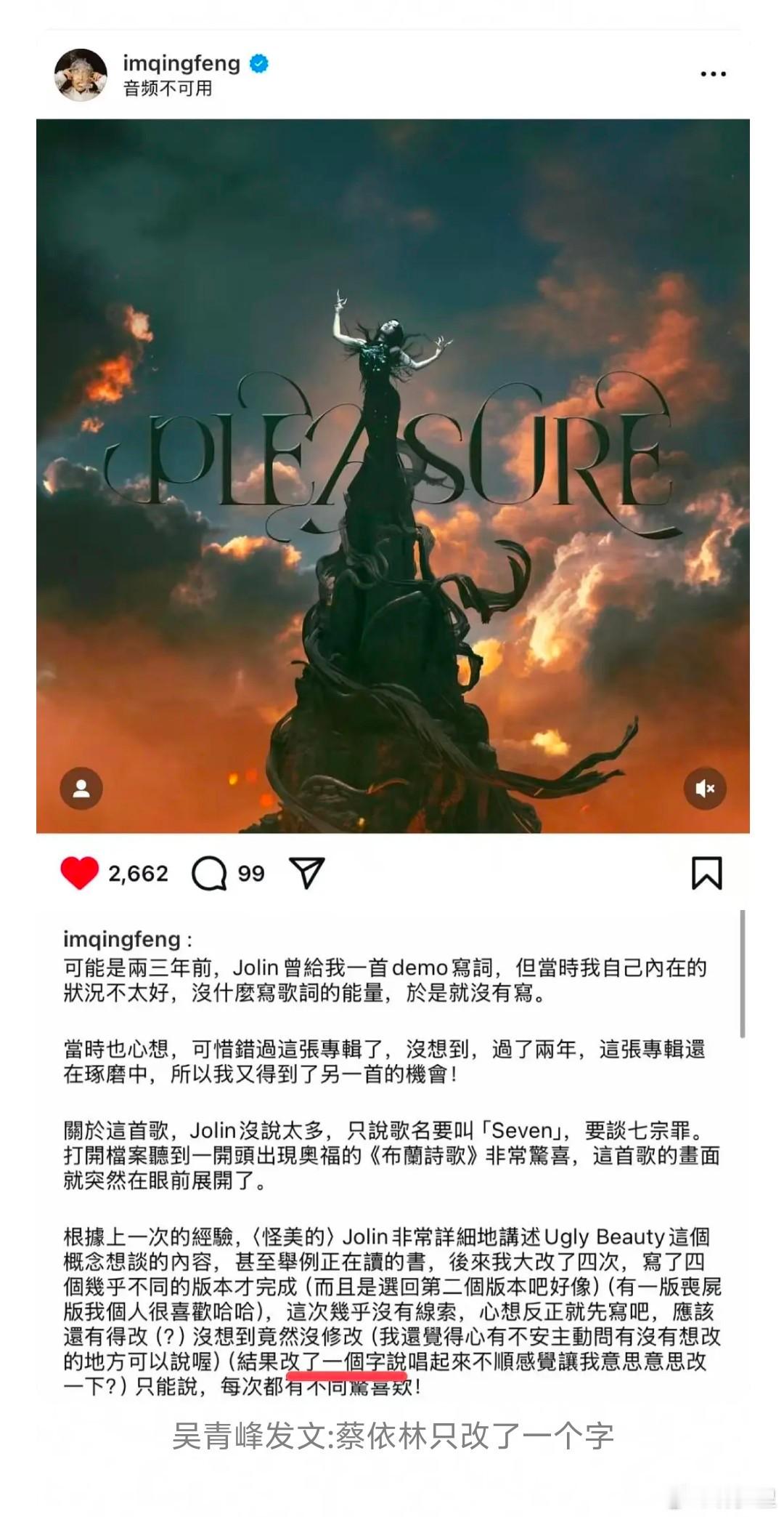 华语天后还干这种事啊。仅改一个字,就抢了别人的一作,给自己凹词曲创作的美名。吴青峰写的,蔡某某只改了一个字,就在作品上署名一作,图1图2。吴青峰自己的po文里,把自己放在一作,图3。粉丝诡辩,即使没有实际写,也叫创作,图4。啧啧啧。