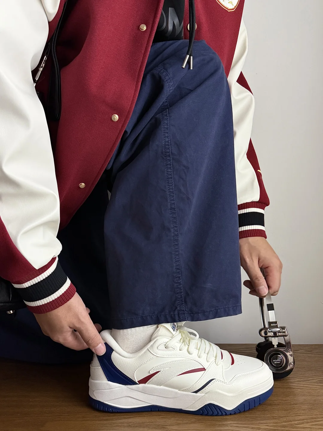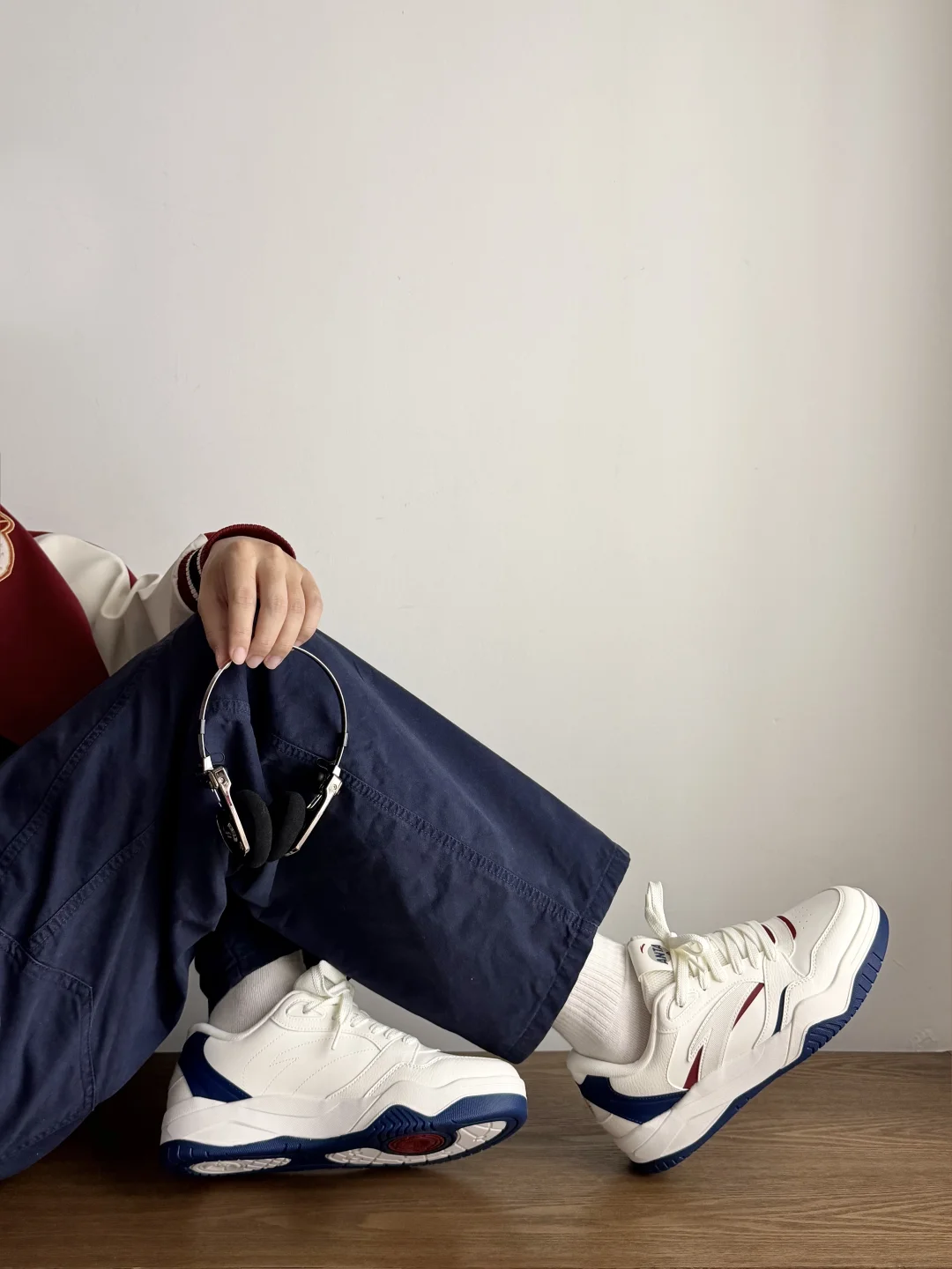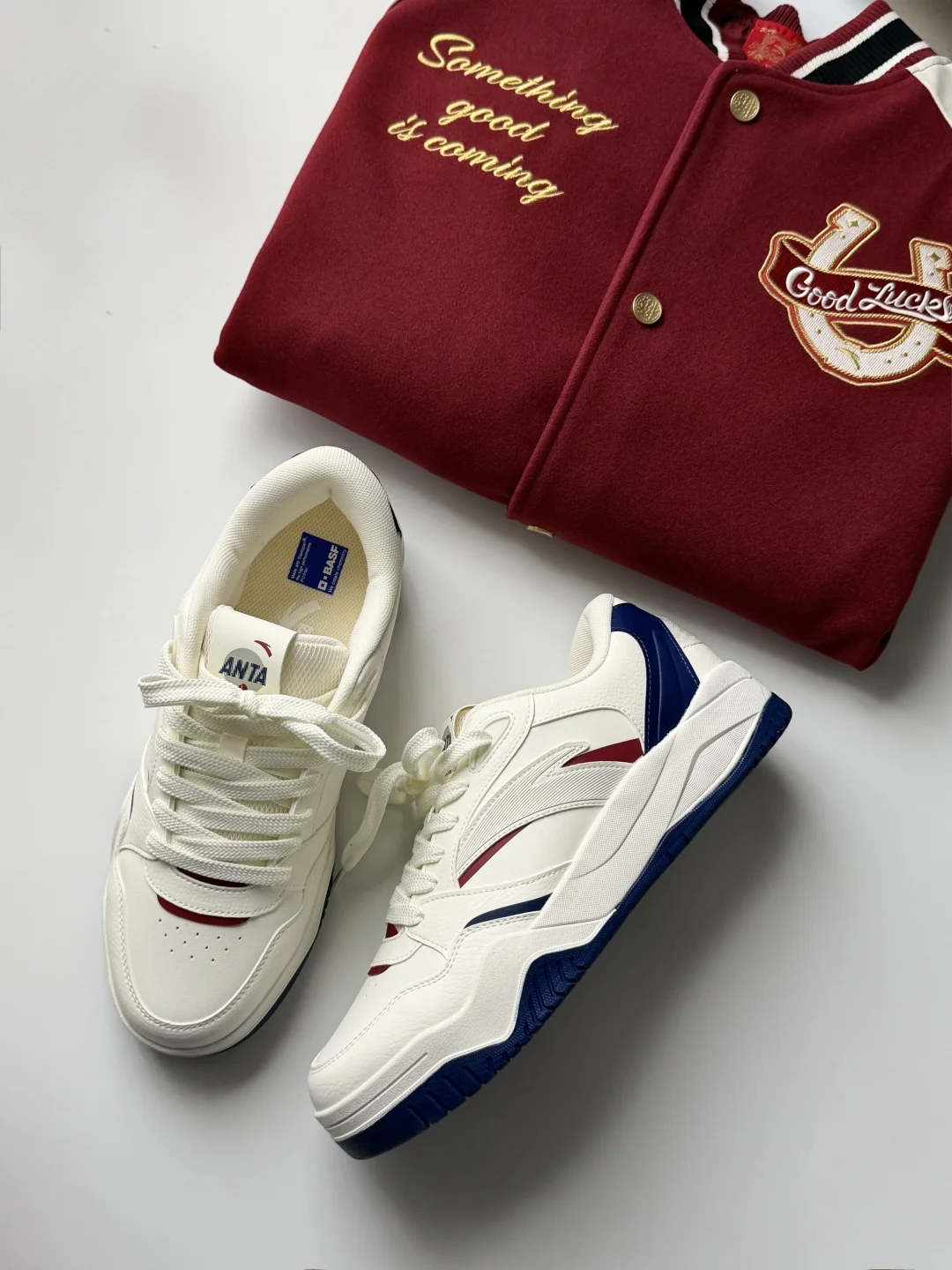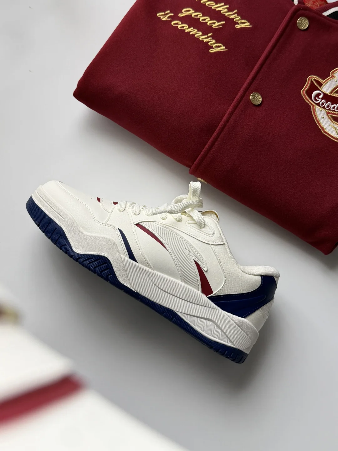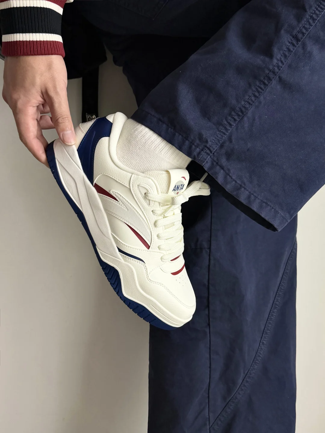 这双安踏波浪鞋4真的长在我审美上! 选的象牙白拼绀青蓝+红辣椒色,米白底色干净又温柔,藏青的色块撞一点红,复古学院那味儿直接拉满~ 鞋型是偏厚底的板鞋款,线条做得很流畅,上脚还能悄悄增高,视觉上腿都显长了。 搭一件他们家的红色棒球服+鞋面颜色的蓝色裤子, 新年氛围这不就来了吗,而且日常穿搭哪怕配休闲西装也不违和