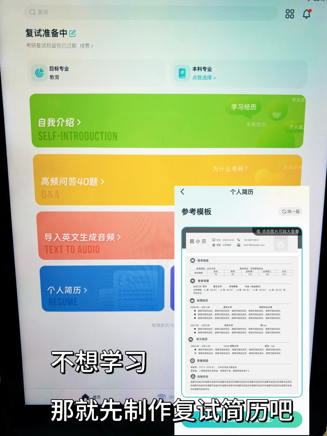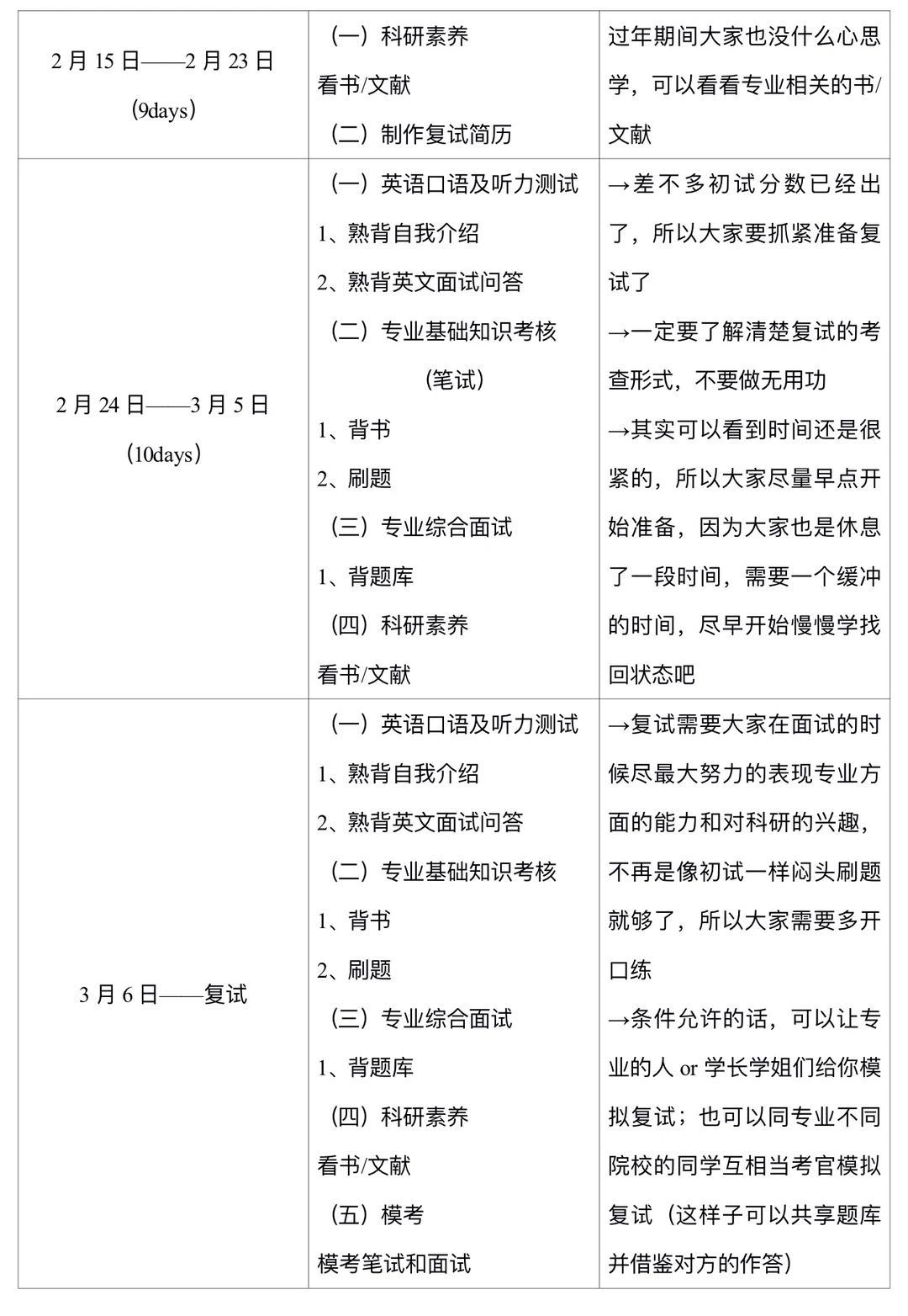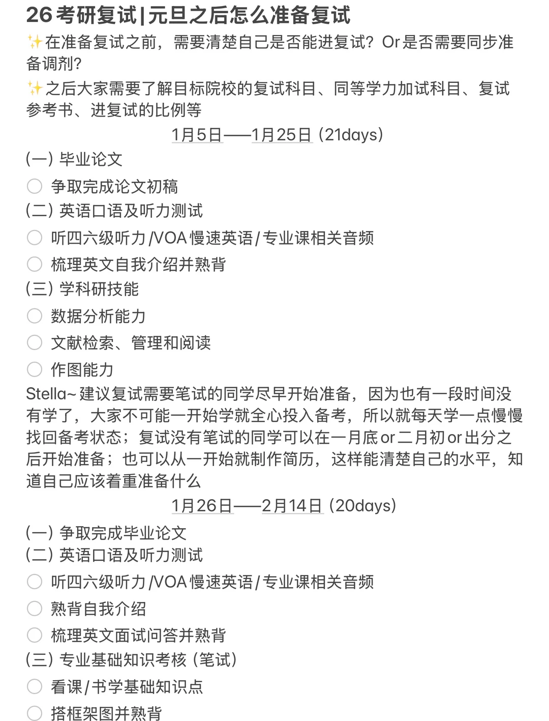 Stella~建议复试需要笔试的同学尽早开始准备,因为也有一段时间没有学了,大家不可能一开始学就全心投入备考,所以就每天学一点慢慢找回备考状态;复试没有笔试的同学可以在一月底or二月初or出分之后开始准备;也可以从一开始就制作简历,这样能清楚自己的水平,知道自己应该着重准备什么