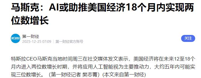 美国GDP很快还要翻倍?马斯克突然发布惊天大预言!美国经济很快要爆发增长,因为AI智能应用!圣诞前后,马斯克在社交媒体上发布,堪称年末最劲爆的“经济预言”。   很多人可能会问,AI到底是怎么拉动经济的?最直接的就是把生产效率拉到了新高度。   以前工厂里老师傅要反复调试好几天的精密零件,现在靠AI十分钟就能生成程序完成加工,普通工人培训30天就能在AI辅助下搞定高精度工作。   制造业是经济的根基,AI这么一改造,产能上去了,成本降下来了,整个经济的增长动力自然就足了。   除了提升效率,AI还掀起了一场史无前例的投资热潮。   现在美国的科技巨头们都在疯狂砸钱搞AI基建,Meta今年在AI基础设施上的支出就预计达720亿美元,明年还会继续增加。   谷歌更是计划在得州投400亿美元建三座数据中心,这笔投资要持续到2027年。   光有企业和资本的热情还不够,美国政府在背后的推动作用也不可忽视。   虽然之前拜登政府出台的《人工智能扩散出口管制框架》被特朗普政府撤销,但新政府转而通过向沙特、阿联酋等中东盟友大规模出口先进AI芯片。   拉拢盟友构建以美国为主导的科技生态,同时换取中东国家数千亿美元的投资,涵盖AI数据中心、能源等多个领域。   除此之外,美国还通过国家AI研究资源项目,整合微软、英伟达等企业的资源,向研究机构开放算力和模型,加速AI在半导体、生物医药这些高端领域的落地。   生物医药领域,以前要十几年、几十亿美元才能研发出一种新药,现在用AI模拟分子结构,时间和成本都能减少一半以上。   金融领域,AI能快速识别欺诈交易,帮金融机构降低风险、提升效率;农业领域,AI通过卫星数据和传感器精准灌溉施肥,大幅提高农作物产量。   而且AI已经不是大企业的专属了,美国银行的数据显示,今年9月美国小企业给科技服务的付款同比增长了6.9%。   其中制造业和建筑业增长最明显,中小企业作为经济的毛细血管,用上AI之后,整个经济的增长潜力就被彻底激活了。   马斯克敢抛出这个大胆预言,可不是凭空猜测,他自己就在亲自下场推动AI发展。   他旗下的xAI公司正在全力推进超大规模计算基础设施建设,位于美国田纳西州的Colossus 2数据中心已经实现约390兆瓦的稳定供电,还计划采购2吉瓦级燃气发电厂支撑未来需求。   除此之外,太空探索技术公司向xAI投资20亿美元,特斯拉的股东也批准了1万亿美元的薪酬方案,支持他把特斯拉转型为AI和机器人巨头。   作为身处AI产业核心的人,他比谁都清楚AI的潜力到底有多大。   马斯克的预言并不是空中楼阁,核心支撑就是AI技术的全面应用。   现在AI已经在制造业、科技业、能源业等多个领域展现出颠覆性的革新能力,不仅提升了生产效率,带动了巨额投资,还催生了新岗位。   再加上美国政府的全力推动和资本的疯狂涌入,这些力量叠加在一起,确实有可能推动美国经济迎来爆发式增长。
