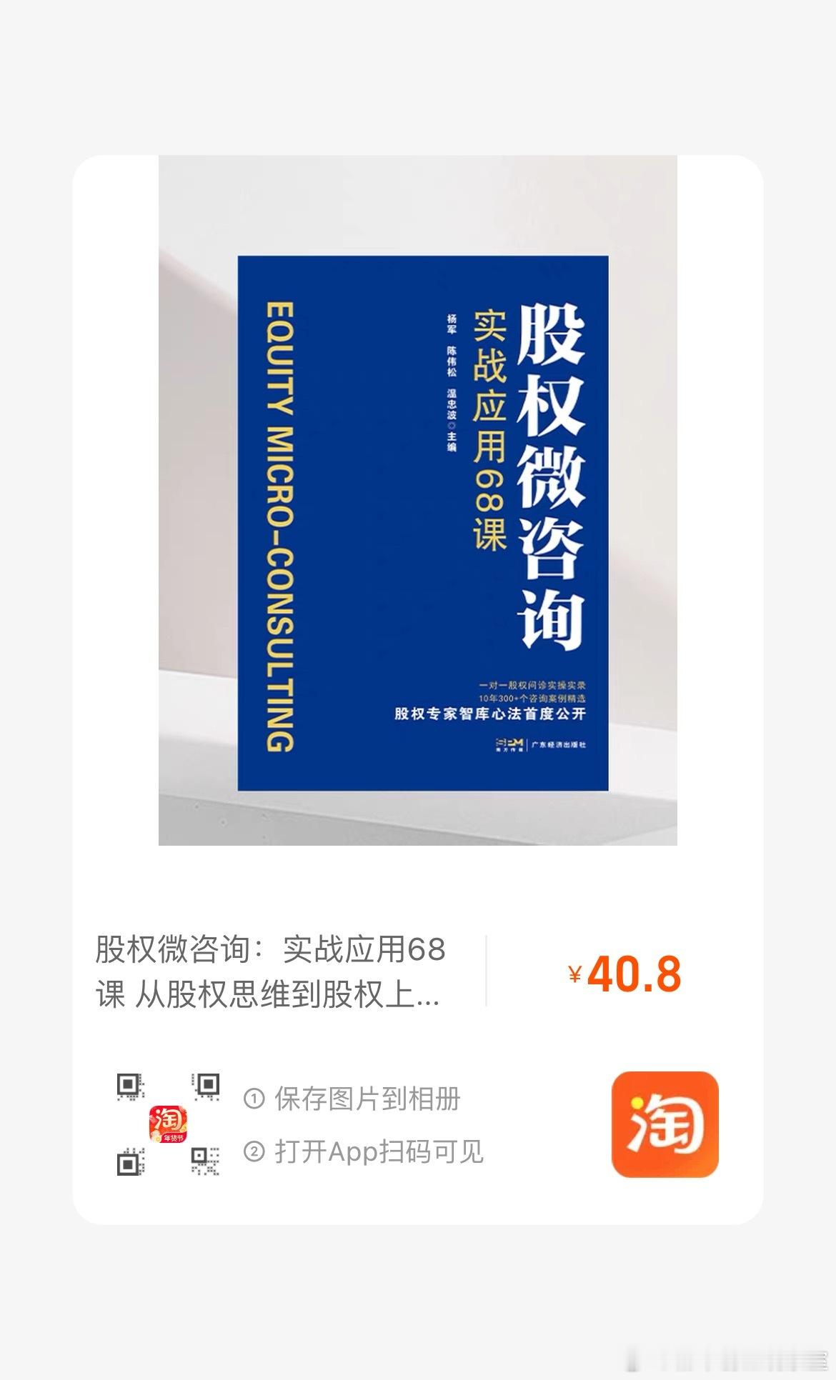 🚀 股权实战宝书来了!《股权微咨询:实战应用68课》正式上架!由杨军、陈伟松、温忠波主编,陈杰、许成涛、黄太阳等专家联袂编撰,这本书从股权思维到股权上市全流程,手把手带你掌握股权实战心法!✅ 一对一股权问诊实操实录✅ 10年300+咨询案例精选✅ 股权专家智库方法首度公开✅ 适合创业者、企业管理者、股权规划学习者📖 书名:《股权微咨询:实战应用68课》🏢 出版社:广东经济出版社🛒 已在天猫、京东、拼多多等平台开售,不同平台略有差异,快去找找适合你的那本吧!如果你也想系统学习股权、避开股权陷阱、打通企业成长的股权关卡,这本书值得入手!股权 实战手册 企业管理 创业必备 书单推荐