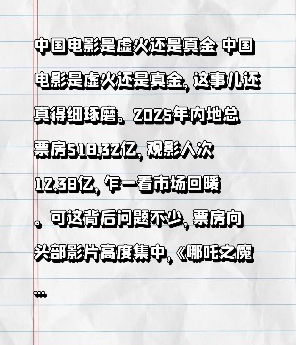中国电影是虚火还是真金 中国电影是虚火还是真金,这事儿还真得细琢磨。2025年内地总票房518.32亿,观影人次12.38亿,乍一看市场回暖。可这背后问题不少,票房向头部影片高度集中,《哪吒之魔童闹海》《疯狂动物城2》两部就贡献近200亿。腰部内容严重缺失,票房过亿新片比2024年减少24部。 有些高票房电影靠营销和档期情绪,“票房高、遗忘快”,像虚火。但也有《流浪地球》《长安三万里》这样靠扎实制作和叙事创新赢得口碑的,是真金。关键就看创作者尊不尊重观众,用心讲故事才能炼出真金。