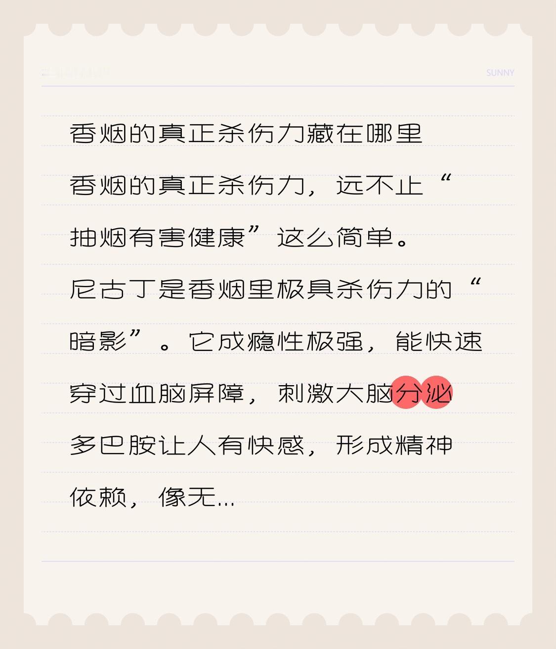 香烟的真正杀伤力藏在哪里 香烟的真正杀伤力,远不止“抽烟有害健康”这么简单。 尼古丁是香烟里极具杀伤力的“暗影”。它成瘾性极强,能快速穿过血脑屏障,刺激大脑分泌多巴胺让人有快感,形成精神依赖,像无形铁链绑住吸烟者,使其不断抽烟,加深身体依赖。 焦油也是“隐形杀手”,会在肺部沉积,破坏肺细胞功能。它含数百种致癌物,大大增加患肺癌风险,还会引发慢性支气管炎、肺气肿等慢性呼吸疾病,往往多年后才被察觉。 此外,香烟中的一氧化碳、苯、甲醛等有害化学物质,会破坏血液等。像57岁的“老烟枪”王先生,抽烟近40年,每天两包,结果查出慢性阻塞性肺疾病,肺功能只剩不到60%。可见香烟的杀伤力不容小觑。