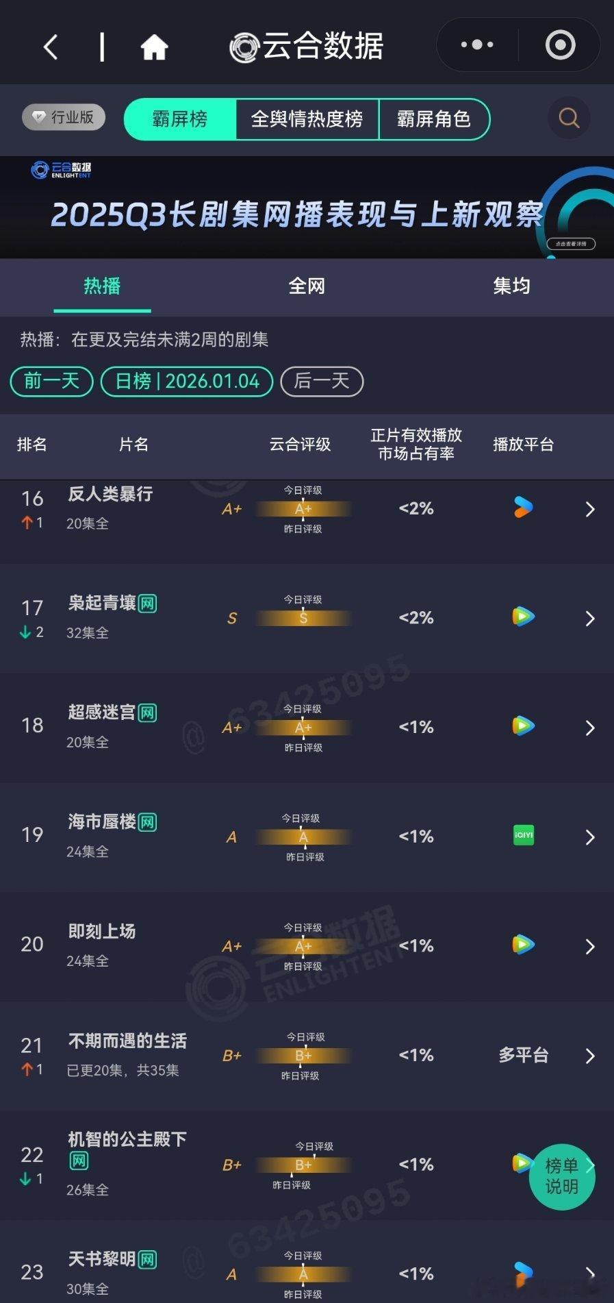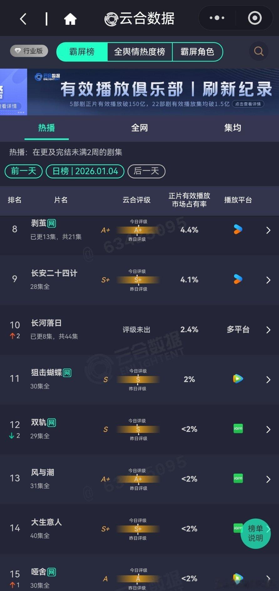 2026年1月4日云合播放占比云合 罚罪2 18.4%骄阳似我 16.2%谁家破万播放量不涨的?小培家。逍遥14.4%评级下降了玉茗茶骨8.5%夹缝中求生存,评级还涨了点,可以啊。人之初5.6%评级大幅上升,跨到S+了,恭喜轻年5.5%稳住了趋势剥茧4.4%有点难。