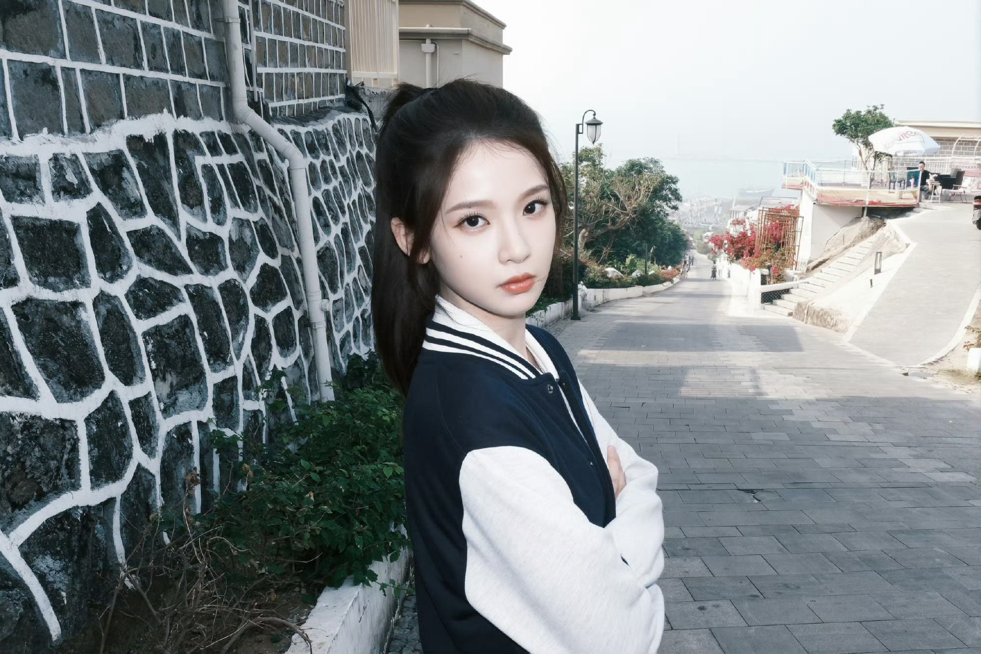 王玉雯穿中学生校服的样子。