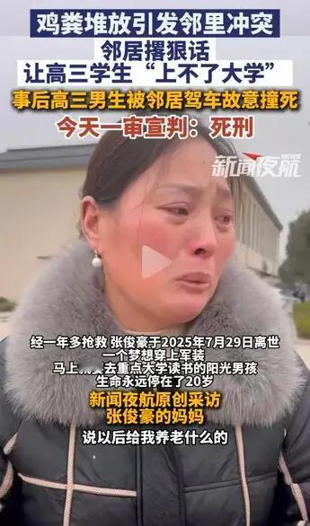 因为邻居家鸡粪堆放的问题。高三男生张某某被36岁邻居驾车故意撞击身亡。张同学的母亲哭诉说:我的儿子好懂事啊!他说以后大学毕业工作就可以养妈妈了。如果他没有离世的话,今年已经上大二了。 邻居两家之间一点小矛盾,邻居家把鸡粪倒到张家门口,双方起了一点小争执,后来工作人员上门调解,处理好了。邻居王某某却扬言绝对不会让你家儿子上大学。 这么点小事,能痛下杀手,多么极端的人。 矛盾发生于2024年2月17日,事故发生于2024年5月29日下午一点多。张某某骑电动车上学,被邻居王某某偶遇,王某某车在开到100迈,故意去撞击他,张某某避让了三次,避让不及。是被撞脑死亡,没有自主呼吸。 在医院里,父母一直没有放弃,坚持抢救。救治了一年多,张某某同学于2025年7月29离世。