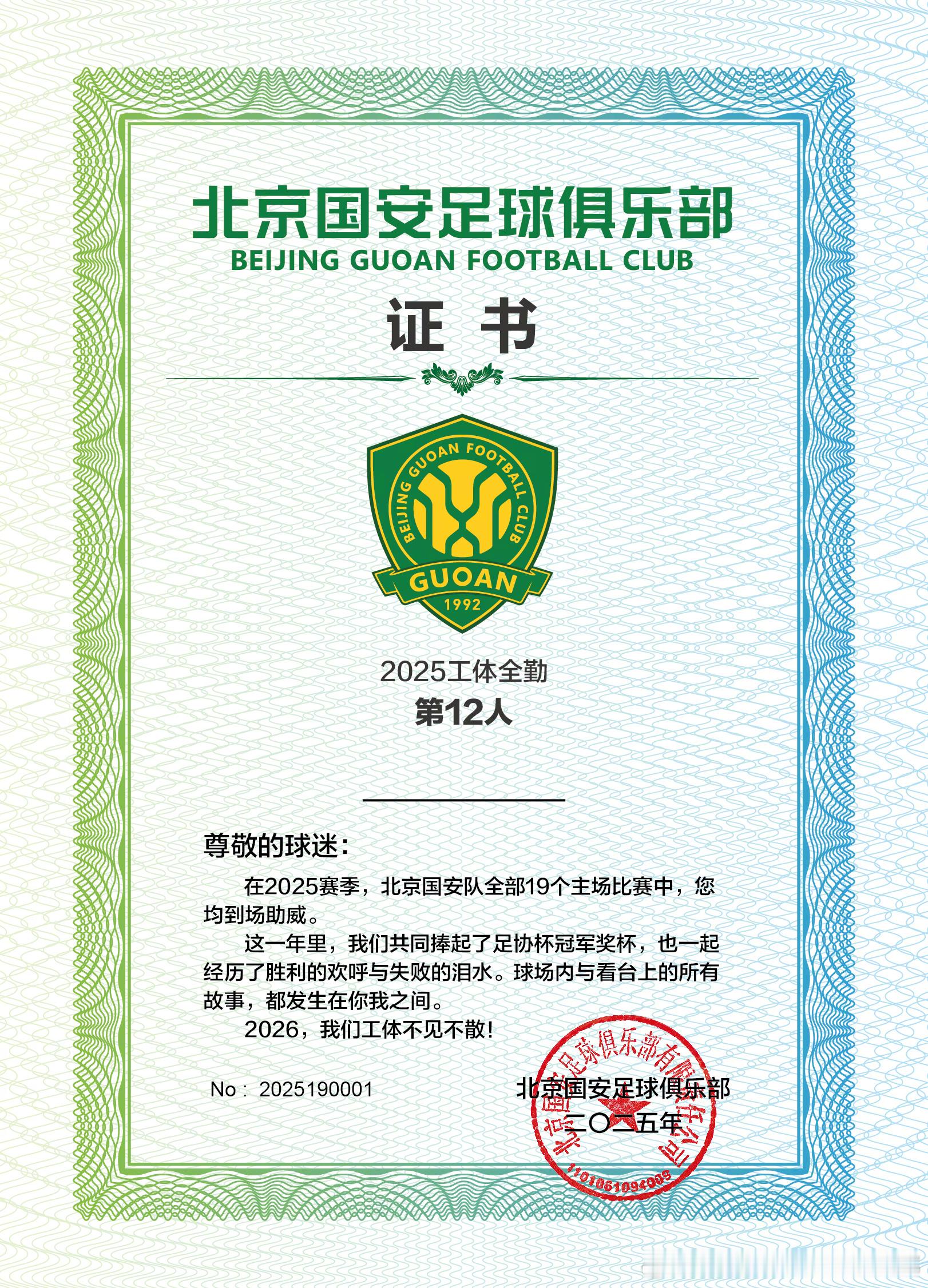 全勤球迷证书领取时间:1月8日(周四)--1月14日(周三),每天10:00-16:00。地点:朝阳区世茂工三商场1层,孚德足球IP专卖店。请各位全勤球迷持本人2025赛季年卡或身份证作为身份凭证,前往活动现场领取证书。如需代领证书,请代领人持被代领人身份证或身份证照片到现场领取。【补录】1月5日(含5日前)收到俱乐部邮件确认完成补录的球迷,也可于8日-14日前来领取证书。(补录名单见链接 )未收到邮件确认的球迷,请您耐心等待俱乐部工作人员核对数据,并于邮件中确认的时间内前来领取证书。【福利】每位全勤球迷均可以领取足协杯夺冠纪念冰箱贴1枚凭借全勤证书,球迷也可在世贸工三孚德足球IP周边店享受购物折扣。全场产品85折,部分产品5、6、7折。(冠军系列产品不参与活动)活动时间:同全勤奖领奖时间。【注意事项】为提升领取证书体验,请您在提供身份凭证的同时,告知工作人员证书编号(编号按姓氏拼音首字母顺序排列,可在公示名单中查询 )。