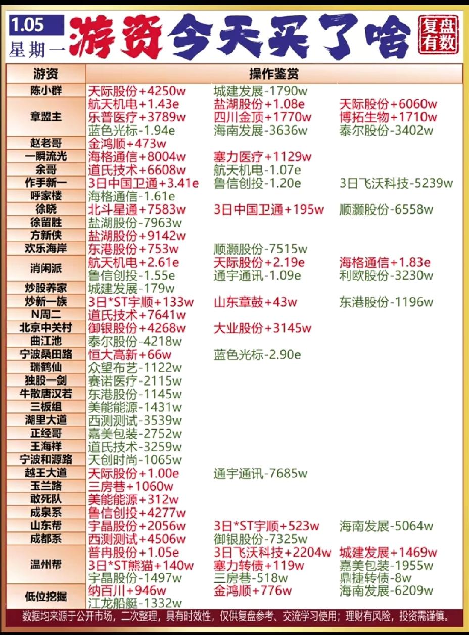 1月5日,周一A股大柚子排行榜!!! 群总买入天际股份4250万、卖出城建发展1790万;章盟主买入航天机电1.43亿、盐湖1.08亿、天际股份6060万,卖出蓝色光标1.94亿、海南发展3636万、泰尔股份3402万!!!