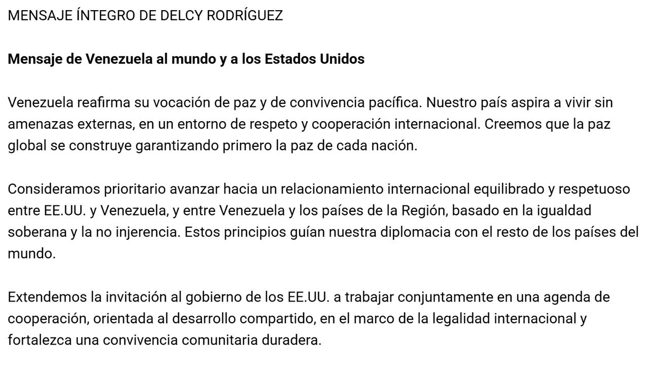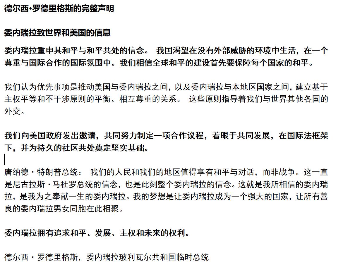 代总统的声明怎么样? 应该算有理、有利、有节吧? 只是在双方实力不对等的情况下,与美国的合作,能有多少能够按照委内瑞拉自己的民族意愿来实施。