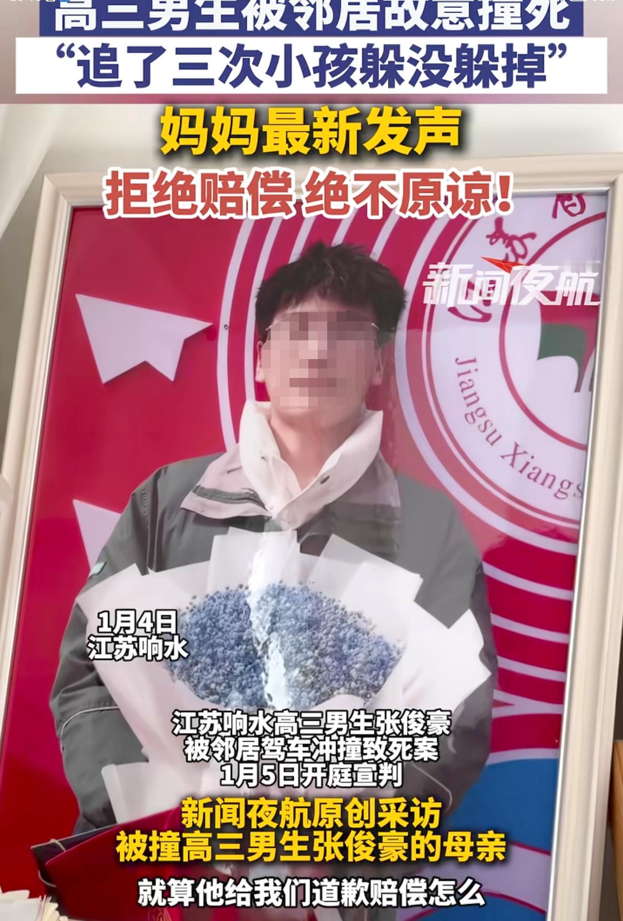 江苏,响水领居之间纠纷升级遭报复 高三男生张俊豪被邻居骑车连撞3次 最后一次张俊豪没躲开 直接被撞成了脑死亡。 不过是邻里间的一点地界纠纷, 竟让36岁的邻居怀恨在心, 对着即将高考的少年三次加速冲撞。 一条本可通往重点大学的光明之路, 被极端恶意彻底碾碎, 父母苦撑一年的抢救, 终究没能留住孩子。 “远亲不如近邻”从来不是空话, 但“恶邻”的偏执足以毁天灭地。 这起悲剧不止是个人恩怨的爆发, 更该敲响警钟:邻里矛盾再小, 也容不得积怨发酵,及时疏导、 理性沟通才是底线。 你觉得该如何守住邻里相处的分寸,避免小事酿成大祸?