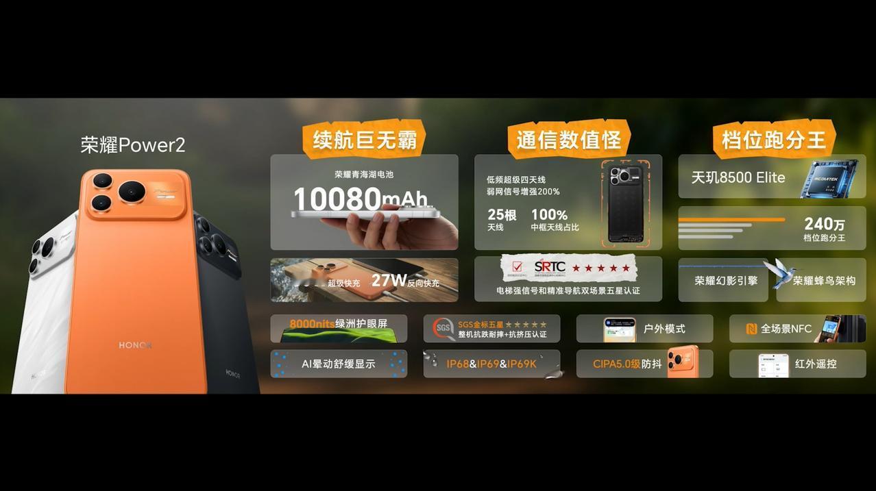 荣耀 Power2 发布,12+256GB 售价 2699 元、12+512GB 售价 2999 元,行业第一款电池破万的量产手机来了!也是 2500 元档,感觉怎么样? - 芯片:首发联发科天玑 8500 Elite 处理器(台积电 4nm 工艺,1× 3.4GHz Cortex-A725 + 3× 3.2GHz Cortex-A725 + 4× 2.2GHz Cortex-A725,GPU 为 Mali-G720 MC8),LPDDR5X 内存,荣耀自研射频增强芯片 C1+,冰封液冷散热系统(总面积 40000mm²); - 屏幕:6.79 英寸 2649×1200 OLED 直屏,支持 120Hz 刷新率,局部峰值亮度 8000nits,3840Hz 高频 PWM 调光; - 相机:前置 16MP,后置 50MP 主摄(OIS,CIPA 5.0 防抖)+ 5MP 超广角双摄; - 续航:10080mAh 第四代青海湖电池(15% 硅含量,能量密度 926Wh/L),支持 80W 快充,30 分钟充电 45%,支持 27W 有线反向充电; - 其他:厚 7.98mm,重 216g,幻夜黑、雪原白、旭日橙 3 款配色,铝合金中框玻纤后盖,鸿燕六翼天线,双频 GPS 三频北斗,双 1115 超线性双扬声器,短焦光学指纹,支持红外遥控、NFC,支持 IP66+IP68+IP69+IP69K 防尘防水,搭载 MagicOS 10 系统,提供 AI 户外模式。