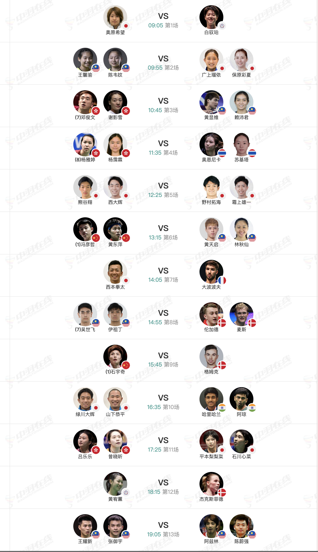 2026年马来西亚羽毛球公开赛 1月6日各单项32进16上半区首日赛程,早上9点开赛:【1号场地】3、梁伟铿/王昶🇨🇳 vs 🇯🇵保木卓朗/小林优吾13、陈雨菲🇨🇳 vs 🇹🇭碧查梦【2号场地】6、冯彦哲/黄东萍🇨🇳 vs 🇲🇾黄天启/林秋仙9、石宇奇🇨🇳 vs 🇩🇰格姆克【3号场地】2、刘圣书/谭宁🇨🇳 vs 🇺🇸弗朗西斯卡/珍妮盖3、程星/张驰🇨🇳 vs 🇯🇵绿川大辉/松山奈未5、郭新娃/陈芳卉🇨🇳 vs 🏴邓恩/麦克菲森10、韩悦🇨🇳 vs 🇰🇷金佳恩14、陈柏阳/刘毅🇨🇳 vs 🇰🇷金元昊/徐承宰