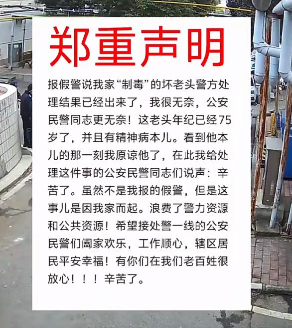 河南平顶山一老头报警,说邻居家制毒,大批警察从天而降,差点破门而入,搞成大乌龙。网友介绍,1月4日突然大批警察围住了他家门,当时只有媳妇在家,非常害怕,不敢开门,就给网友打电话,网友感觉莫名其妙,怎么就犯罪了?急忙打电话报警,警察接到电话后,核实是虚惊一场,还好警察没有贸然破门,否则就成笑话了。查明原因,是邻居75岁老头报假警,可是他有精神病,警察也拿他没办法,网友就更没辙了。平顶山警方