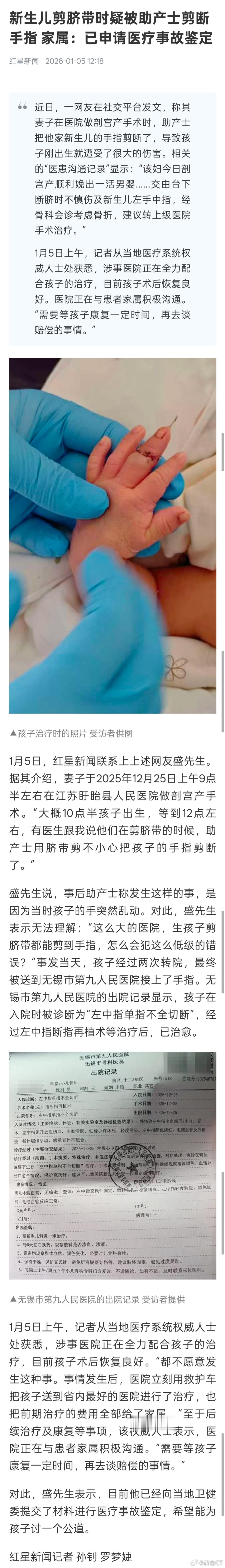 涉事医院回应新生儿被剪断手指把相关报道找来看了下,属实是离谱得很。做剖宫产手术,助产士居然在剪脐带时,把婴儿的手指剪断。另据家属爆料,不仅涉事医院没给出合理解释,涉事助产士也只是回家反省了几天,就又返岗工作了。这么大的事情,难道不应该把事故原因先查清再说吗?新生儿疑被助产士剪断手指